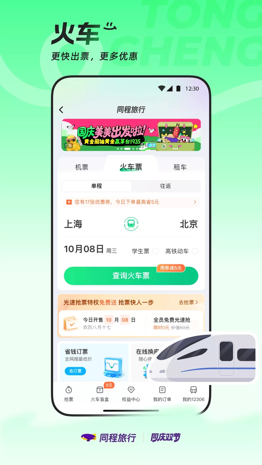 中国铁路出品,人民铁路为人民,买火车票就用铁路12306!铁路12306网站(含手机客户端)是中国铁路唯一官方火车票网络售票平台,从未授权任何第三方平台发售火车票。 我们的特色: 【售票无加价】不收取加速包费用,不捆绑保险销售,不收取会员费,让您购票放心。 【信息更准确】晚点、停运信息,列车出发、到达信息,车厢、车型信息,第一时间获知,让您出行安心。 【功能更全面】火车票、机票、汽车票、网络订餐、酒店住宿、旅游等近百项功能,让您旅行无忧。 【服务更温馨】满足老年人的大字版,满足视障等特殊人群的无障碍版,让您使用便捷。 主要产品及服务: 【火车票预订】 1.无票候补。车票售完不用慌,无票候补帮您忙。提交候补需求,当因退票、改签或新增列车等产生可供发售的车票时,自动为您出票。 2.选座选铺。喜欢靠窗看风景?喜欢靠过道便捷?喜欢上铺清净?喜欢下铺方便?选座选铺一键指定心意座/铺位。 3.智能中转。没有直达方案?中转服务智能为您推荐换乘方案。 4.车站大屏。查看列车出发、到达信息,让您轻松掌握行程,送站接人更加便捷。 【机票预订】 航司官方直营店入驻,官方机票服务,购票更安心,出行有保障。 【汽车票预订】 覆盖全国随时出发!提供国内公路客运信息、汽车站、线路时刻的查询及汽车票预订服务。 【联运服务】 提供空铁公水多交通方式一站式购票及信息查询服务,省时省心,出行更多选择。 【出行服务】 提供高铁订餐、酒店预订、约车接送站、铁路游、景区门票预订、铁路商城、出行保险等服务,吃住行游购娱,一款APP满足您的出行需求。 【温馨服务】 提供临时乘车证明、重点旅客预约、遗失物品查找等便捷服务功能,让您出行无后顾之忧。 【会员服务】 提供会员权益及支持使用积分兑换车票等相关服务。 更多信息请关注 微信公众号:铁路12306