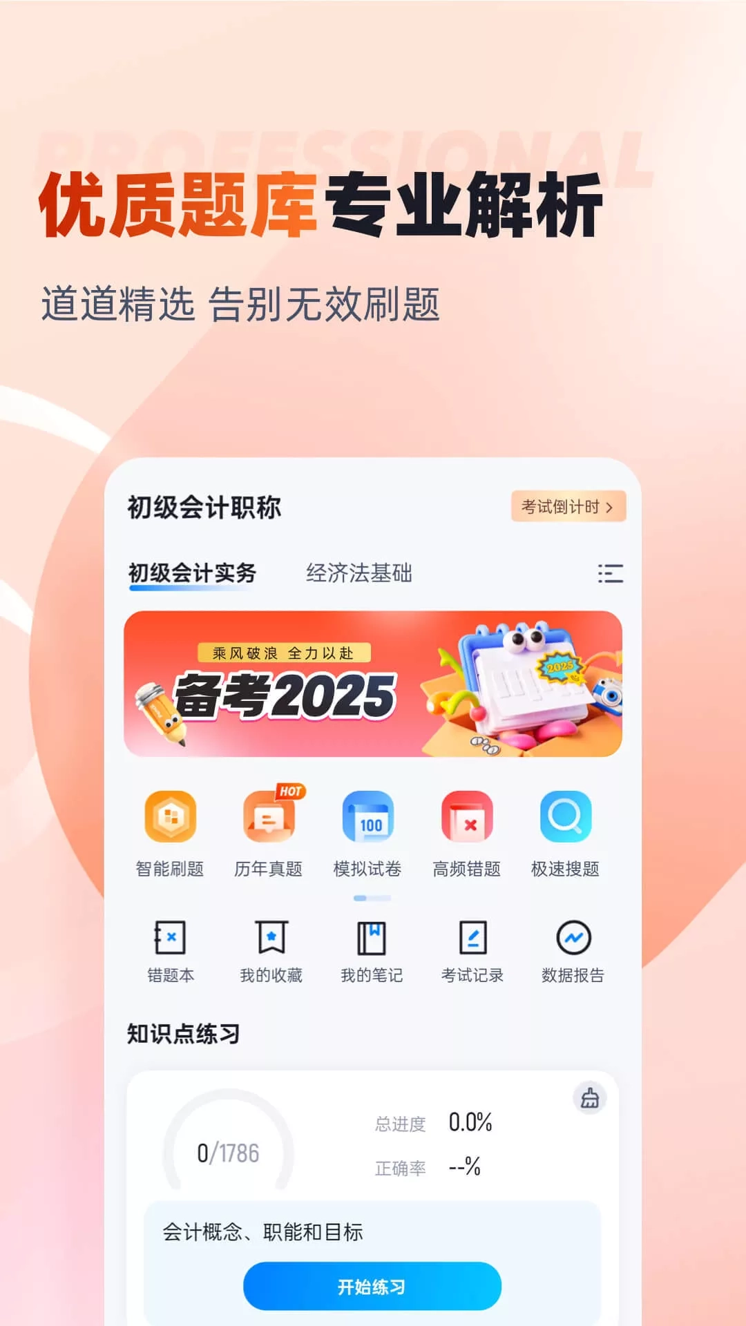 2025年初级会计职称考试备考力荐题库! 今年初级会计职称考试难不难?马上下载去体验! 准题库科目全面,职业覆盖率高,为每个科目学员精心准备的考试配套题库,内容涵盖:精选题库、强师讲解、章节精讲、高频考点、历年真题、冲刺密卷等多个模块,整理结合书本知识点,助力一站式效率备考。随时随地学习、省时省力备考。 【2025年初级会计职称考试 强师讲解】 初级会计职称考试研究专家视频解读初级会计职称考试备考策略,强师效率教学,紧抓重难点! 【2025年初级会计职称考试 章节精讲】 根据初级会计职称考试大纲及官方教材修订补充,从基础抓起,章节考点课程精讲,更有对应章节练习题及视频讲解! 【2025年初级会计职称考试 高频题库】 初级会计职称考试高频考点+高频易错,深入解析,助你牢记常考、易错点! 【2025初级会计职称考试 历年真题】 全套历年考试真题汇总,以题带点,加快掌握初级会计职称备考知识点! 【2025年初级会计职称考试 冲刺密卷】 全套初级会计职称备考试题,模拟实战考试练习,详细解读考点,掌握考试技巧,助你拿证!