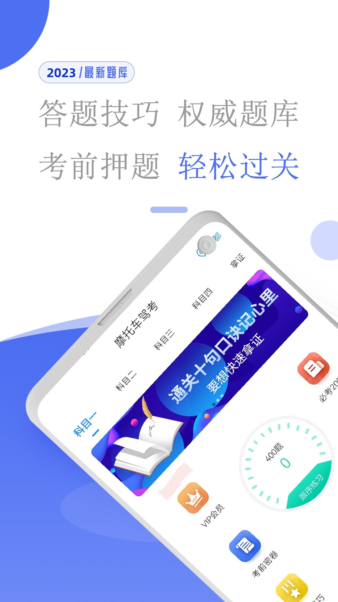 考摩托车驾驶证的知识,仿真模拟考试。 电动摩托车,两轮摩托车,三轮摩托车考证助手。 摩托车驾考题库是学车全网实时更新的DEF驾驶证考试题库! 摩托车驾照考试就用摩托车驾考题库!学开车的驾考学习助手! 摩托车驾考学员、小车驾考学员强烈推荐! 学车必备驾考,自此摩托车驾考题库,轻松拿驾照。 全新题库:全网题库实时更新D证,E证,F证 丰富做题模式:各种练习和答题模式,深入浅出有效的帮助学员快速学习驾考理论与实操。 【全新题库】全网题库实时更新 【做题模式丰富】丰富的做题模式学习更轻松 【专题练习】题型分类,巩固学习,精准突破 【错题库】自动统计练习错题,针对性巩固练习模拟考试,难题易错题一网打进 【收藏夹】可以在练习过程中自行收入题目到收藏夹,形成自己的小题库,提高通过率 【离线做题】学习不用互联网,速度快 【四天通关】四天专项通关练习 【答题技巧】精简答题技巧,做题不再出错 【实战模拟】超逼真的模拟测验 【多种字体】可调整题目字体大小 注:题目如有错漏之处,希望大家不惜赐教,多多包涵,反馈给小编实时改正。