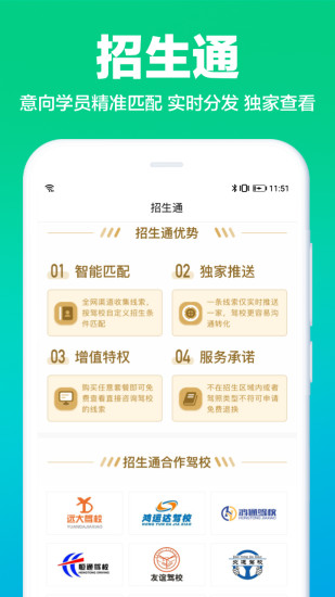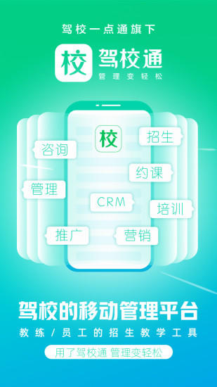 驾校通是一款为驾校和教练量身定制的集招生推广、教学培训、统计报表、运营管理为一体的产品,是驾校和教练的移动管理平台和招生工具,致力于帮助驾校及教练解决招生难题,提升教学水平、管理效率和服务质量。 产品功能 【驾校管理】驾校通移动管理平台,学员档案、招生统计、考试记录、财务报表、员工绩效等实时掌握。 【约课管理】预约培训智能化管理,学员预约、教练排课多种模式,教练实时获取课程安排,教学培训更高效。 【招生通】品牌招生服务,专属特权独家推送意向学员,智能精准匹配,真正解决招生难题。 【报名咨询】整合潜在意向学员、销售跟进全流程管理,轻松提升招生转化和业绩。 【营销推广】招生名片、招生海报、招生段子、限时特惠、优惠券等素材一键获取,随时分享转发。 【教练服务】注册教练官方认证,平台免费展示,教练可收到驾校一点通的学车学员信息,帮助教练招生。