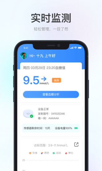 【 实时动态血糖监测记录】 不用扎手指,即可实现实时持续记录葡萄糖数据和变化趋势。您可以实时查看当前的葡萄糖数据以及预测您的血糖变化趋势,方便您及时调整应对。 【 个性化血糖分析报告】 佩戴CGM期间,可查看每日血糖总结,包含当日趋势图、血糖达标率血糖波动水平等。 佩戴CGM满5天,即可生成动态血糖图谱(AGP)图谱,动态血糖图谱(AGP)是国内外指南一致推荐的持续葡萄糖监测(CGM)的标准化葡萄糖监测报告,反映您的血糖水平和血糖波动水平,能更好地指导你控制血糖。 另外,设备结束监测后会自动生成动态血糖报告,里面包含控糖红绿灯,数据一目了然,糖友也能快速读懂自己的血糖控制情况。 【专业控糖服务】 专业医护团队24小时在线,如果你有控糖和健康方面的疑问,可以随时在线咨询。 【免责申明】爱看健康应用程序内健康资讯、建议、方案仅供参考,但不作为诊断、确诊和治疗依据,也不成为任何享有法律效力的书面证明文件,不能代替医生面诊和医院诊断。具体治疗建议请遵循医嘱!
