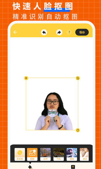 一键智能抠图,轻松更换背景!无须任何P图技巧,简单几步,手机也能抠出完美效果。 【智能抠图】 运用AI技术,精确的识别功能,帮你轻松实现抠图,生成透明背景图换背景。 【证件照】 本地选择或拍摄一张正面照片,支持多种证件照尺寸,无需手动p图,专业的人像识别算法,手动对照片人像进行磨皮、美白等,快速拍出自然好看的证件照。还支持更换证件照底色,多种背景色可选。 【图片编辑】 支持对图片进行裁剪、压缩、修改尺寸和格式转换。使用编辑功能,简单的几步操作,轻松满足你的照片编辑需求。 【九宫格切图】 可将一张照片一键秒出九宫格图片,让您轻松制作出有趣的相片墙。 【照片拼图】 可将多张照片无缝链接生成一张图片,轻松实现照片的组合创作。