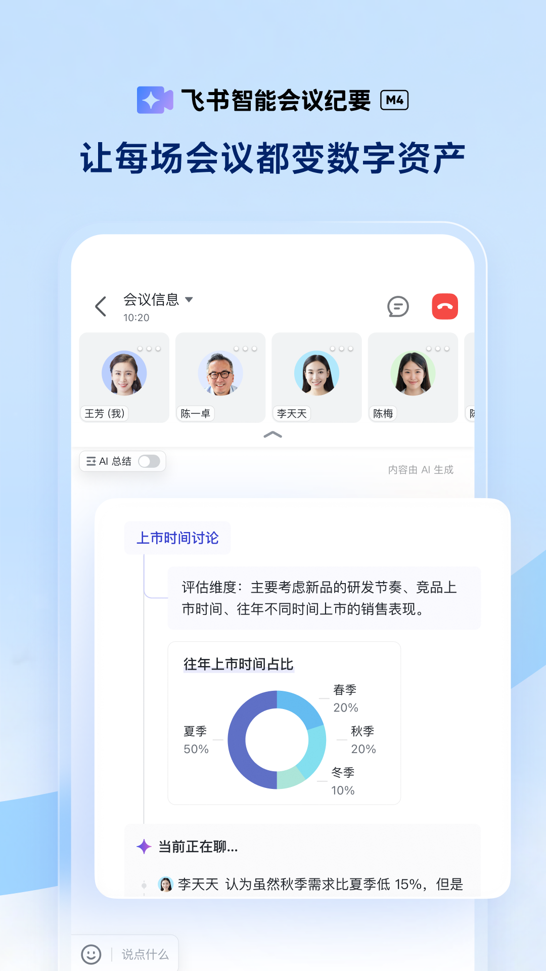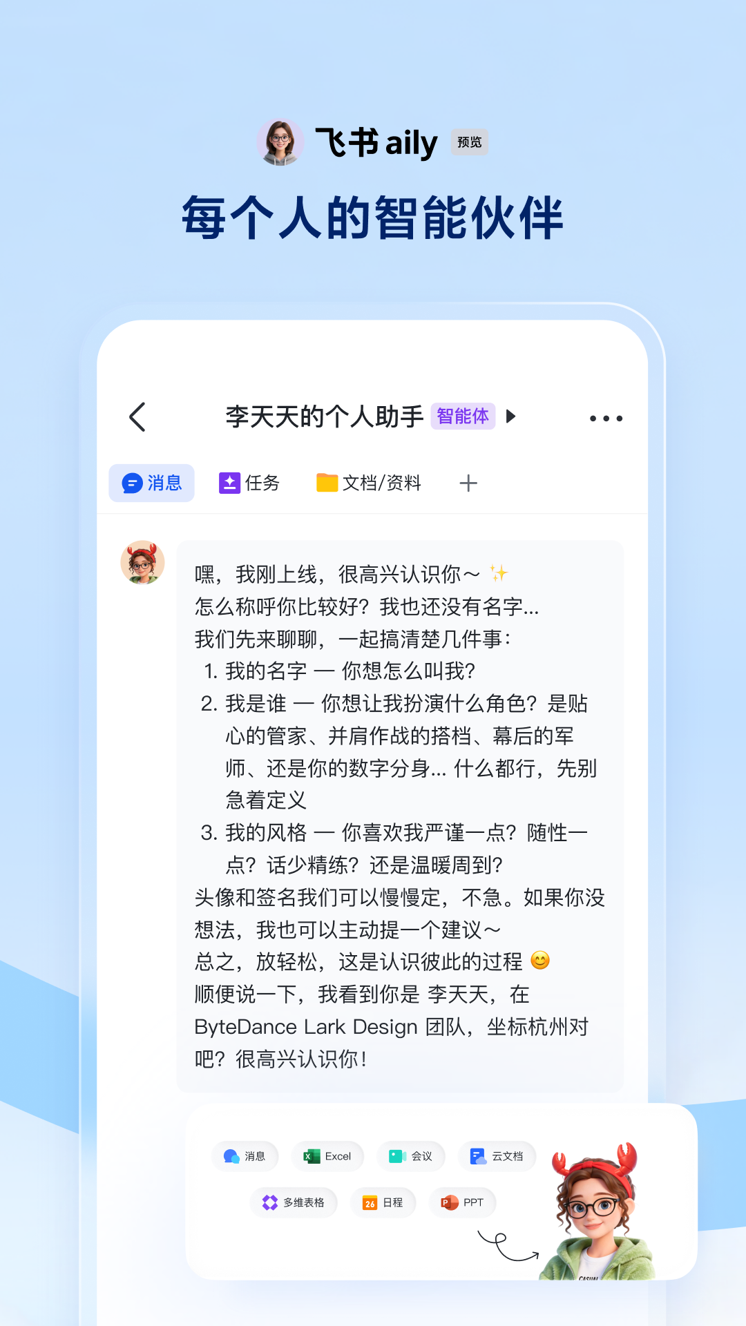 飞书是字节跳动旗下 AI 工作平台,将 AI 能力深入融入企业协同办公、组织管理与业务提效场景,让 AI 真能用、真落地。先进团队,先用飞书。<br>飞书上新 AI 能力一览:<br>- 飞书 aily:官方 AI Agent,无需安装、一键启用,深度融入日常工作流,懂你所有工作上下文、有记忆、会主动工作,越用越懂你<br>- 飞书 aily 专业版:复杂任务的专业伙伴,支持模板风格选择与局部元素精准修改,一站式数据分析与可视化,与飞书所有数据资产完全打通<br>- 飞书智能会议纪要:会中实时总结、会后全面回顾,精准会议纪要与待办提炼,每场会议都成为组织数字资产<br>- 飞书多维表格 AI:融合豆包、DeepSeek R1 等领先大模型,业务一张表,AI 满血跑<br>- 飞书知识问答:开箱即用的企业专属 AI 问答工具,基于企业所有飞书知识工作,让知识转化为 AI 生产力<br>- 飞书 OpenClaw:一键部署、免配置,稳定 7×24 小时在线的云端 AI 伙伴,Agent 直接调用飞书各类能力帮你工作<br>此外,飞书还提供消息、音视频会议、云文档、知识库、日历、审批、邮箱等一站式协同能力,为 AI 沉淀企业数字资产,让每一个人工作更高效。<br><br> <br>【联系我们】<br>邮箱:contact@feishu.cn<br>如有问题或建议,欢迎通过邮件与我们联系。<br>先进团队 先用飞书