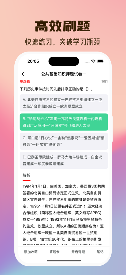 专为公共基础知识考试设计的题库,提供了全方位的备考支持,每一道题目都附有详细的答案解析,帮助考生进行系统的复习。无论身处何地,都能随时随地进行学习和练习,且兼容手机、平板等多设备使用。 【题库介绍】 产品特点 ①更新迅速,紧跟最新考试大纲和教材调整; ②题量丰富,涵盖历年真题、章节练习和模拟题; ③考点全面,部分题目附有视频讲解,重点难点随时学习; ④解析深入,通俗易懂,帮助理解; ⑤错题自动归档,优质题目可手动收藏,帮助查漏补缺; ⑥提供错题分析,智能生成个性化试题,强化薄弱环节。 让你专注于学习本身。无论是利用碎片化时间还是安排系统的学习时段能为你提供高质量的支持,助力你考试中取得优异成绩。