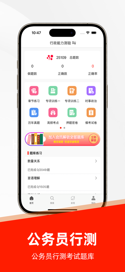 公务员考试行测题库是历年国考公务员及地区公务员考试,含模拟考试,专项练习,根公务员行测大纲,随时随地练习,助你上岸; 【特色功能】 【视频课程】视频课程,名师精讲,高效备考; 【公务员考试行测】行测内模块:模块内容清晰,有答题与背题两种模式,每道题附解析; 【模拟考试】智能随机100题,智能测试,100%模拟考场; 【历年真题】最近几年真题精选; 【错题库】错题加入错题库,反复练习; 【行测题库分类】 第一部分:数量关系 一、数字推理。 二、数学运算。) 三、数量关系。 第二部分:言语理解 一、词语辨析。 二、语境分析。 三、语句排序。 四、语句链接。 五、言语理解与表达。 六、病句辨析。 七、片段阅读。 第三部分:判断推理 一、图形推理。 二、定义判断。 三、类比推理。 四、逻辑判断。 五、判断推理。 第四部分:常识判断 一、文化常识。 二、政治常识。 三、经济常识。 四、科技常识。 五、地理常识。 六、法律常识。 七、国情常识。 八、历史常识。 九、人文常识。 十、生活常识。 第五部分:资料分析 一、倍数。 二、比重。 三、增长。 四、平均。 五、对外贸易。 六、百分点。 七、资料分析。