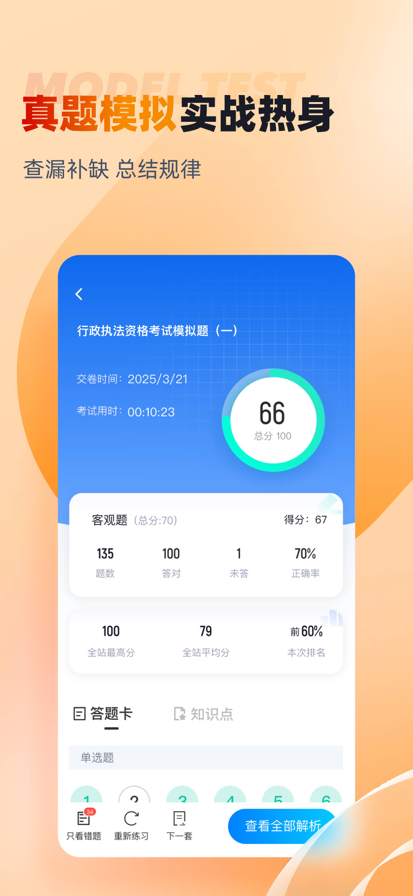 行政执法资格考试聚题库——专业备考 精准训练 助力执法能力提升 备战行政执法人员资格认证考试?行政执法资格考试聚题库是您专业可靠的备考助手。我们提供权威精准的练习资源,助您系统掌握行政执法专业知识与实务技能,从容应对考试挑战。 真题模拟实战演练 应用内精选汇集历年考试真题及高质量模拟试卷,严格依据最新考试大纲与执法规范精心编写。通过模拟考试功能,您可体验真实考场环境,进行全真限时测试。考试结束后,系统即时生成详细分析报告,清晰展示您在行政法基础、执法程序、证据规则、法律文书等各模块的掌握情况。智能评估系统精准定位知识薄弱环节,帮助您明确复习重点和改进方向。 系统化知识点练习 我们依据考试要求将知识点科学分类,涵盖行政处罚法、行政许可法、行政强制法、行政复议法、国家赔偿法、执法程序规范、证据收集规则、法律文书制作等核心内容。每个知识点模块都配有专项练习题和详细解析,帮助您深入理解行政执法专业知识。您可以根据学习进度选择对应章节练习,巩固理论基础,掌握重点难点。 行政执法资格考试聚题库集权威真题模拟与系统知识点练习于一体,设计科学,操作便捷。通过反复的实战演练和针对性训练,帮助您夯实专业基础,提升执法实务能力。应用内容持续更新,紧跟最新法律法规和考试动态,是您备考复习、查漏补缺、提升通过率的专业工具。立即下载应用,开启高效备考之旅,为行政执法资格认证奠定坚实基础。