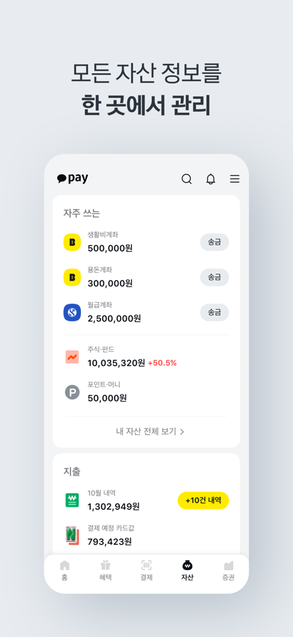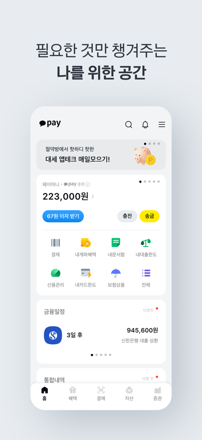 카카오페이 하나로 모두가 금융할 수 있도록 “마음 놓고 금융하다, 카카오페이” 카카오페이, 이렇게 써보세요 ■ 결제 - 어느 탭에 있든 '결제' 탭 두 번 누르면 결제 준비 끝 - 결제혜택도 맞춤으로, 가까운 혜택까지 다 챙겨서 결제 - 멤버십 적립, 만료 가까워진 쿠폰도, 알고 있으면 유용한 결제 팁까지 한 번에 확인하고 결제 - 제로페이도 되니까! 어디서나 카카오페이로 결제 - 위젯만 있다면 잠금 화면에서도 바로 결제 - 손목만 내밀면 끝! 애플워치로 결제 - 생체 인증으로 빠르고 편하게 결제, 바코드와 QR코드로 장소 제한 없이 결제 ■ 자산 - 송금, 결제, 카드, 계좌, 보험, 대출, 투자까지 돈 쓸 일 많은 요즘, 번거로운 공인인증서 없이 가능한 자산관리 ■ 증권 - 투자에 필요한 맞춤 정보 제공, 다양하고 빠른 주식 주문 경험 - 간편하게 시작하고 자동으로 수익을 쌓는 주식 모으기 - 세액공제도 받고 투자 수익도 내는 연금저축 - 거스름돈도 모으면 태산! 부담없이 시작하는 펀드 동전모으기 ■ 보험 - 가입한 모든 보험, 카카오페이에서 가입 내역부터 보장 내용까지 간편 관리 - 복잡한 서류 제출 없이, 간편한 병원비 청구 - 자동차보험 고민 끝! 10개 보험사 비교로 내 차에 꼭 맞는 자동차보험 찾기 - 카카오페이에서만 경험 할 수 있는 특별한 보험상품도 만나보세요 ■ 혜택 - 출석체크, 퀴즈타임, 매일모으기, 만보기 등 재미있는 혜택 서비스로 현금처럼 사용할 수 있는 페이포인트를 매일! 쉽게! 모아보세요. ■ 송금 - 계좌번호 몰라도, 카톡 친구가 아니어도 바로 송금할 수 있는 내 주변 송금 - 모임 회비, 용돈, 경조사비 등 깜박하지 않고 원하는 주기와 날짜에 예약 송금, 자동 이체 - 카톡 친구에게 보낼 때, 카카오페이에 등록한 내 계좌로 보낼 때 무료로 송금 ■ 안심하고 사용하세요 - 핀테크 업계 최초, 금융보안원 정보보호 개인 정보 관리체계(ISMS-P) 통합 인증 - 빅데이터・AI 기반 이상거래 감지시스템(FDS) 구축 ■ 꼭 필요한 권한만 확인해요 - 정보통신망법 제22조의 2(접근 권한에 대한 동의)에 따라 아래와 같이 카카오페이 앱 사용 시 필요한 접근 권한을 안내해드려요. 선택 권한 (선택 권한은 허용하지 않아도 해당 기능 외 서비스 사용이 가능해요) - 알림: 서비스 이용 시 필수 알림 수신 - 카메라 / 마이크: 송금 및 결제 시 코드 스캔 또는 촬영 등 - 위치: 송금 및 결제 시 위치 확인 - 사진: QR 코드 이미지 저장 - Face ID: 카카오페이 비밀번호 및 화면잠금 비밀번호 입력을 대체 - 동작 및 피트니스: 만보기 걸음수 확인 - 블루투스/로컬네트워크: 송금 가능한 주변인 탐색 * 선택 권한은 허용하지 않아도 해당 기능 외 서비스 사용이 가능해요. ■ 당신을 위해 열려있어요 - 카카오페이 고객센터 챗봇(카카오톡): 24시간, 365일 상시 - 상담사 연결: 평일 9시~17시 30분 - 고객센터: 1644-7405 (평일 9시~18시) - 분실 및 도용신고: 1833-7483 (24시간)
