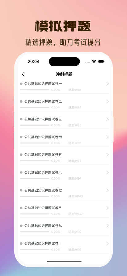 【题库定位】 本题库是为公务员考试、事业单位招聘、三支一扶、教师编制等公职类考试量身打造的权威备考资源,聚焦"公共基础知识"科目核心考点,覆盖政治、法律、经济、管理、公文、科技、人文历史、国情时政八大知识模块,助力考生系统构建知识框架,快速提升应试能力。 【题库特色】 多维知识体系 • 政治理论:含马克思主义基本原理、中国特色社会主义理论、二十大最新精神 • 法律基础:民法典、行政法、宪法等高频考点精析 • 时政热点:重大会议/政策/科技成就专项汇编 • 人文科技:历史大事件轴、物理化学生活常识图解 智能学习系统 • 模块化训练:支持按知识点/题型/难度三级筛选 • 大数据分析:智能推送薄弱环节专项练习 • 全真模考:套省考/市考真题重组卷 • 错题云同步:自动生成个人错题本及考点图谱 【适用场景】 • 零基础考生构建知识体系 • 冲刺阶段查漏补缺 • 时政热点突击记忆 • 公文写作格式强化 • 法律案例专项突破 【更新机制】 • 时政板块:每月更新重大会议/政策文件解读 • 法律模块:实时追踪新修法规 • 模考试卷:按各省最新考情动态调整命题侧重 【使用建议】 推荐"三阶备考法": ① 基础阶段:按模块完成练习 ② 强化阶段:智能组卷模考+错题重做 ③ 冲刺阶段:时政半月谈+高频考点速记