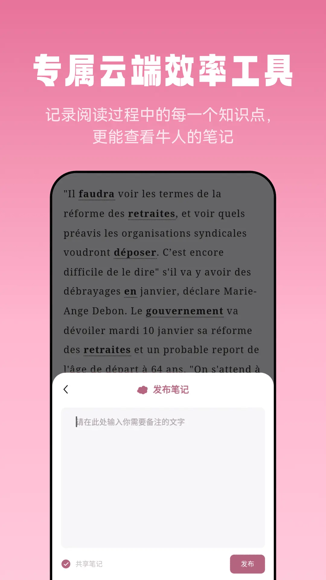 【莱特法语学习背单词】—— AI智能规划+艾宾浩斯记忆法,零基础高效掌握法语词汇!<br><br>✅ 科学背单词<br>◇ 智能定制计划:艾宾浩斯记忆法|每日词量自由设定|精选词库(含欧标A1-C2高频词)<br>◇ 多维度记忆:单词卡片(简/详模式)+ AI发音评测 + 法语听写 + 循环听学 + 弹幕背词<br>◇ 趣味学习:游戏化记忆(连连看/拼写挑战)+ 生词本重点强化<br><br>✅ AI实战训练<br>◇ 真人级口语陪练:模拟日常对话/商务谈判/旅行应急法语<br>◇ 语法精讲:初-高级分层教学 + AI语法解析 + 实用例句公式<br>◇ 全能法语词典:单词详解(变位/搭配/例句)+ 拍照翻译<br><br>✅ 场景化学习<br>◇ 零基础入门:发音规则→基础会话闯关课<br>◇ 实用速成:留学/旅游/职场场景(点餐/问路/面试)<br>◇ 考试专项:DELF/DALF备考(A1-C2)+ TCF真题模拟<br><br>✅ VIP特权解锁<br>无限AI对话|高级词库|语法精讲|发音纠错|离线学习<br><br>✅立即下载「莱特法语」,用AI征服法语!<br>✅ 搜索关键词:<br>法语背单词|法语学习|自学法语|法语词典|法语自学|学习法语|法语单词记忆|法语入门 | 法语