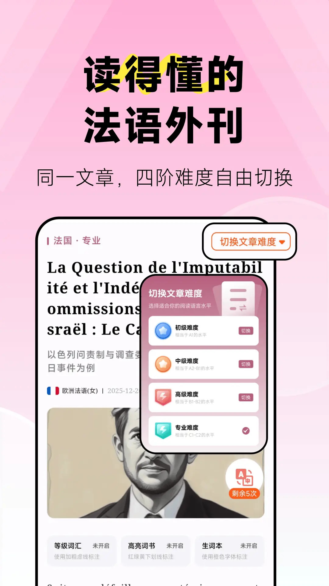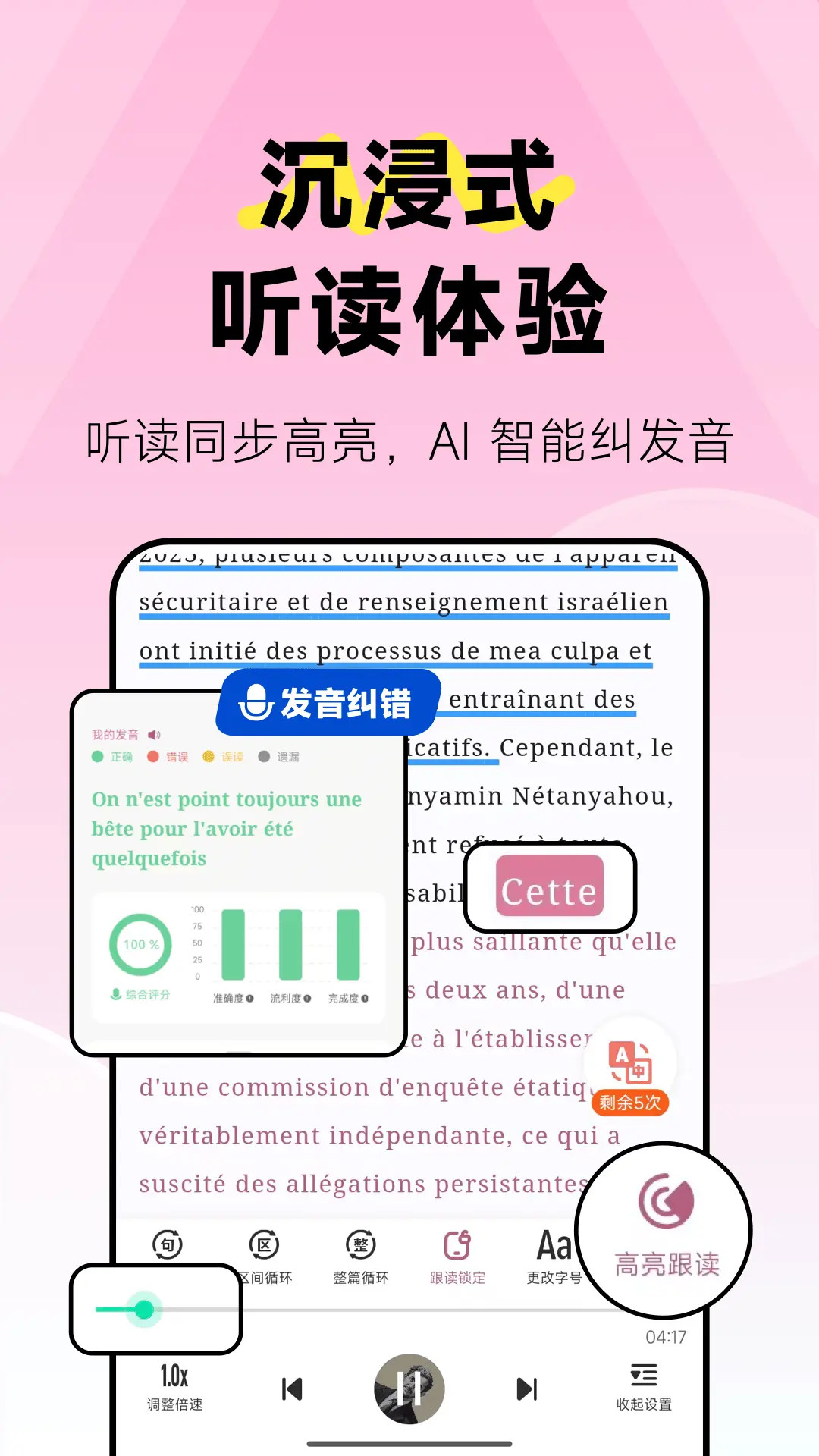 《莱特法语阅读听力》是学习法语高效的阅读和听力软件 - 拥有及时更新的海量阅读和听力库,并提供智能语音高亮跟随功能。 - 与《莱特法语学习背单词》无缝集成,查词典、背单词轻松搞定。 - 全新艾宾浩斯和人工智能练习模式,让你训练阅读听力的同时不知不觉增加法语词汇量 - 智能文章阅读理解练习题目,边读边练习并提高你的阅读理解能力 - 经典的法语名著,匹配您法语水平的分级阅读,无论入门还是高阶,法语阅读听力高效学习助手 - 口语练习,跟着经典法语练习口语,AI智能打分,学习口语不再难 【体贴的操作方式】 - 创新的点词搜索功能,对文章中的单词即指即译 - 支持等级词汇高亮显示,显著提升单词量 - 支持等级词汇详解,提供翻译参考,阅读更高效 - 高亮标注《莱特法语学习背单词》里的词书单词,背单词和阅读听力同步学习,事半功倍 【与《莱特法语学习背单词》无缝集成】 - 《莱特法语学习背单词》是权威的法语学习背单词软件 - 支持口语练习,口语打分 - 支持生词本、学习记录自动同步 - 支持单词复习记忆功能 【联系我们】 - 提交问题工单:软件内『我的』-『我的反馈』-『我要反馈』