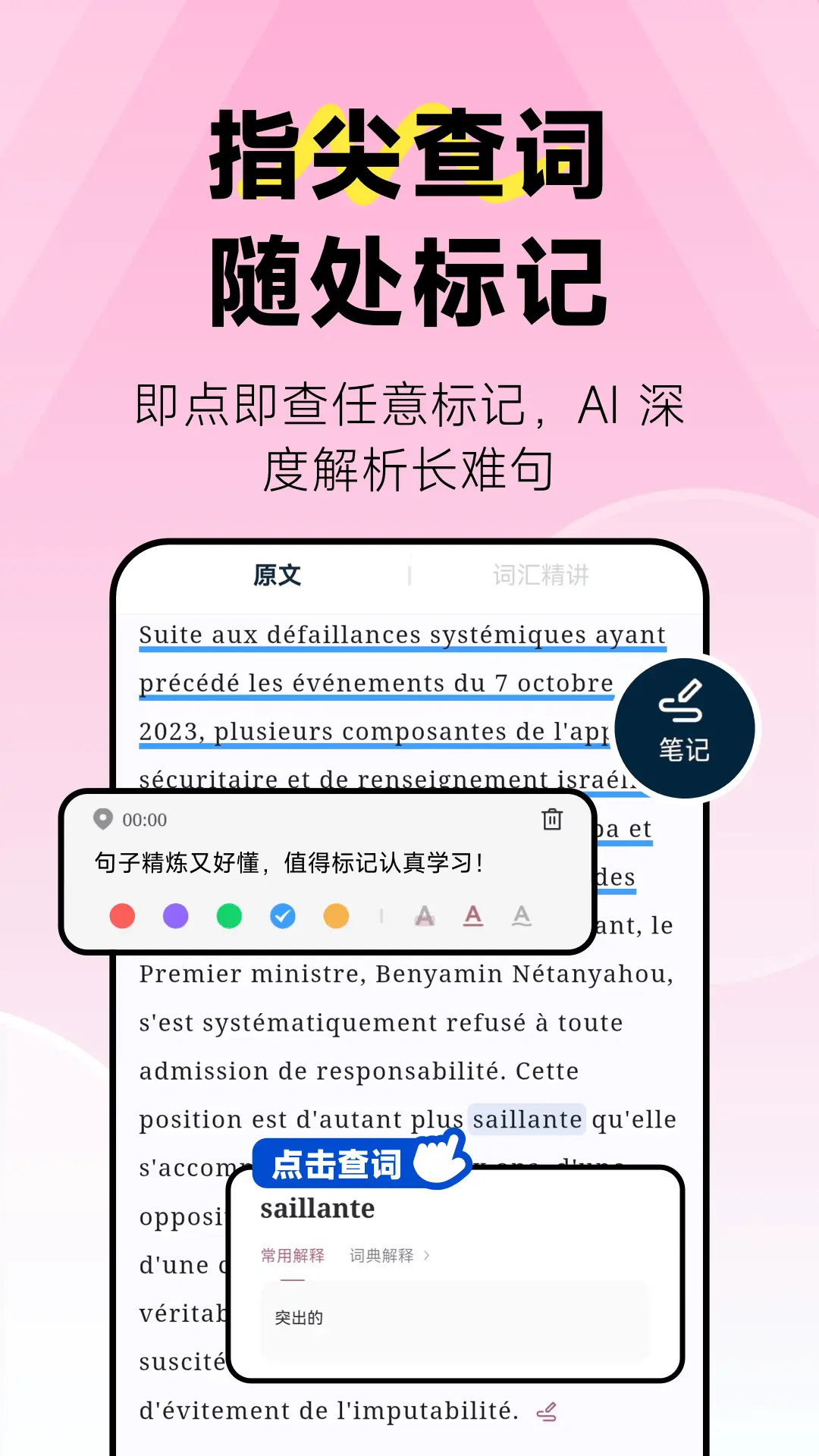 《法语助手》是一套针对中国法语学习者特别设计的教育软件。软件以法语词典为基础,包含词典、动词变位查询、法语例句查询,法语学习参考等功能,是法语学习的必备软件。不仅能够查词、翻译、笔记、背单词,更引入了主题写作、批改纠错等AI功能,全方面改变你的法语学习。 ====《法语助手》提供了权威的法语学习参考==== - 法汉 - 汉法词典、法法词典、法英词典,历经数年修订,权威详实; - 准确音标,同时内置真人法语发音、全球各地法语发音让你了解每个单词的读法 - 原声例句:收集时事新闻中出现的句子,配以原声发音,让你知道单词的实际用法; - 法语百科:收录了海量法语时事新词热词、网络俚语,让你了解法语单词背后的知识; - 历年真题库:收录历年法语考试真题,轻松知道考试高频词汇; - 人名地名、百科讲解、词根词源功能,一个软件全部收录; - 法语动词变位查询,提供18种时态的动词变位反查功能; - 法汉例句库:内置五百万句法汉对照例句,方便查询参考; - 可以安装扩充的法法词典,方便中高级使用者。
