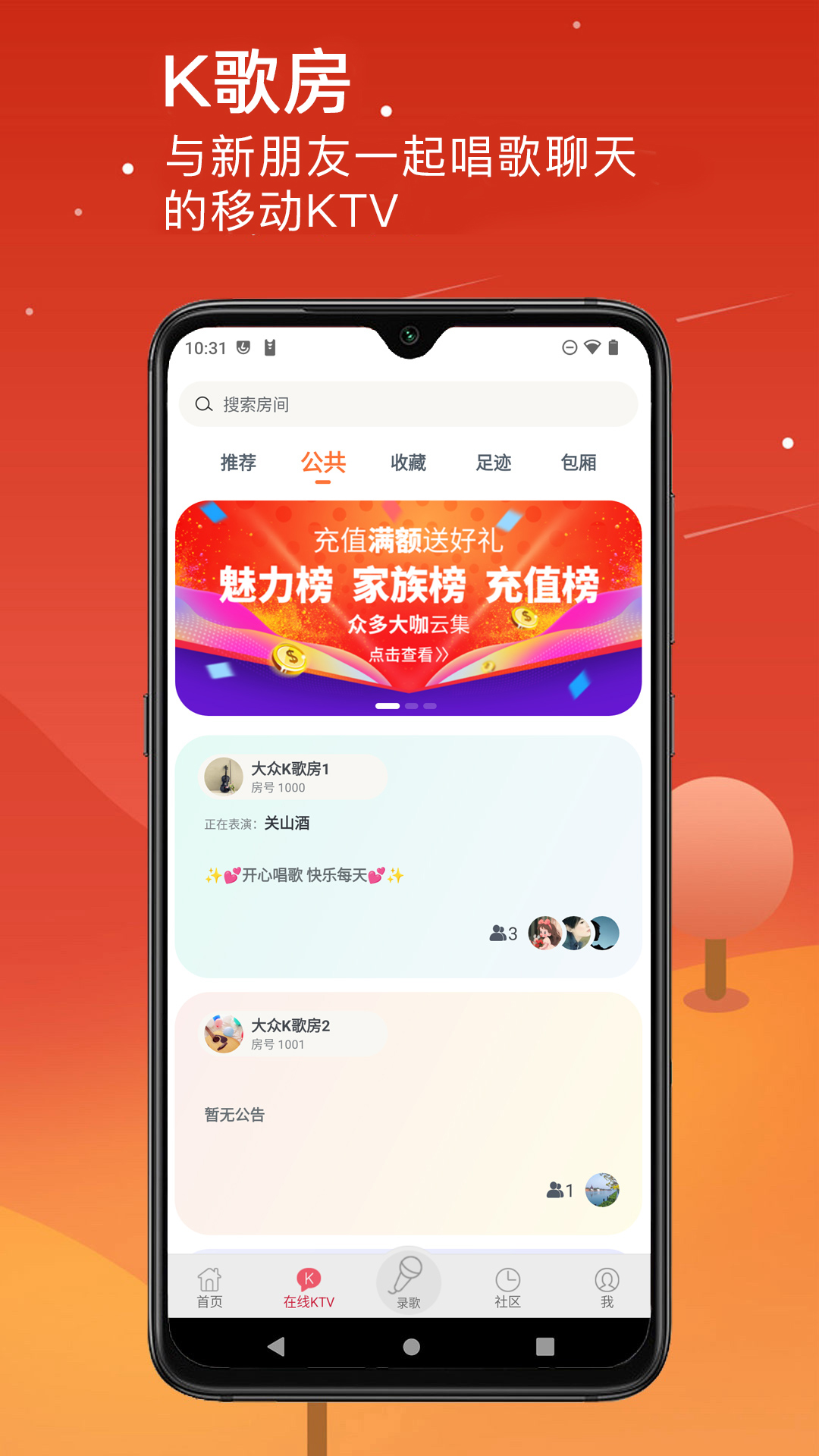 *K歌达人-K歌动人心弦,达人无处不在* *一款全民参与的唱歌互动手机K歌App。全球新歌声、好声音的汇聚地,一个纯粹的音乐平台。这里有新鲜的音乐分享、海量免费高清伴奏、KTV录音功能,任你“唱”所欲为,让全世界聆听你的声音。* ------------------------------------------------------- Ta不仅仅只是个练歌神器,Ta还可以酱紫玩。。。 * K歌房(仿佛置身于KTV,与三五好友实时K歌。家族K歌房,玩转你的音乐朋友圈) * 每日精选(首页人气板块,不间断搜罗平台好声音) * 星打歌(用海报宣传我的歌~从此妈妈再也不怕我的好嗓子石沉大海了~) * 我是星探(用你挑剔的耳朵搜寻潜藏的好声音,还能赚金币哦) * 合唱(双人深情对唱、多人合唱随心唱) * 缤纷多彩的家族活动等你来捧场 * 我们从未停止过软件开发的脚步,对我们而言,为您带去好的K歌体验是我们永远不会放弃的追求 * 不论您有任何疑问或是建议,我们都非常乐于与您交流、沟通。请警惕任何以‘K歌达人’名义索取财物的通知与消息,如发生此类情况,可以通过以下渠道与我们取得联系哦 新浪微博:@K歌达人herook(http://weibo.com/herook) 电子邮箱:service@kuro.cn 另:欢迎关注我们的微信订阅号:kurooke