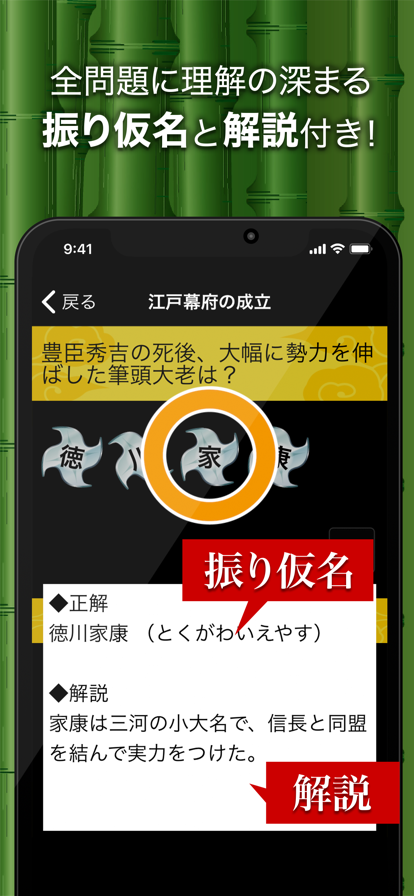聖徳太子の冠位十二階、清少納言の枕草子、足利義満の金閣、織田信長の長篠の戦い、江戸幕府の幕藩体制、坂本龍馬の薩長同盟、明治政府の廃藩置県、戦前の二二六事件... 習ったハズなのに思い出せない、知らないと恥ずかしい、日本史のキーワードが、一問一答のクイズ形式で出題されます。 問題は全部で430問。縄文時代から現代までの14の時代から、好きな時代を選択してチャレンジしてください。 また、まとめて暗記・復習したい人には、時代ごとに、歴史の大きな流れが分かるまとめページがおすすめ!キーワードを隠したり表示したりする機能が付いています。 クイズの内容はどれも基本的で重要なものばかり。歴史好きの方だけでなく、中学社会の歴史や、高校の日本史を勉強中の方にもおすすめです!目指せ全問正解! 本アプリは、無料です。無料ですべての問題、無料で全ての機能をご利用頂けます。 本アプリは、広告ネットワークから配信を受け、広告を表示します。 「はんぷく」は学校ネット株式会社( Gakko Net Inc. )の登録商標です。 不具合を発見された方は、アプリ内のお問い合わせからご連絡ください。