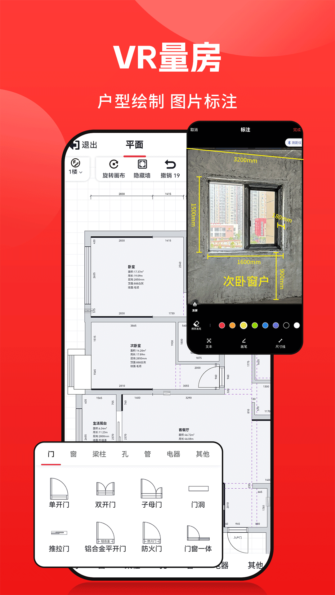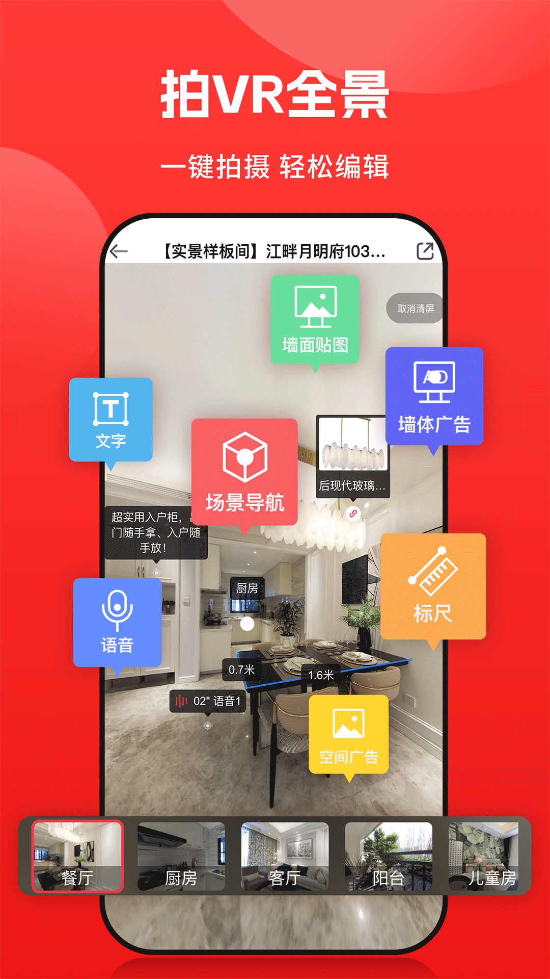 全景拍摄 | 全景制作 | 装修量房 | 图片标记 | 水印打卡 | 施工日志 | VR直播 | 同屏互动 | 营销分享 【全景拍摄制作】| 全景记录 >全景照片拍摄:搭配小红屋全景相机全型号可拍摄超高清全景照片,一键拍摄,自动拼接,轻松上手。 >全景作品制作:丰富的编辑功能,可在全景作品中添加音乐、语音、文字、图片、视频、GIF图、导航、品牌信息等。 >全景作品分享:制作好的全景作品可一键分享至微信、朋友圈、抖音、微博,装修圈等各大平台,支持转全景视频。 >全景作品管理:拥有作品集、项目、产品手册、楼书等多种形式分类管理全景作品。 【量房测绘】| 装修量房/户型图绘制/直出CAD文件 >户型图绘制:简单的绘图逻辑,轻松好上手,支持导出CAD格式和尺寸清单。 >一键测量:搭配小红屋精灵量房仪,尺寸数据,一键录入。 >丰富构件:包含市面上多种门、窗、柱等构件形式,轻松拖拉拽,1:1还原量房现场。 >拍照记录:支持拍照、拍全景记录现场。 【图片标记】| 门窗/卫浴/隔断/窗帘等局部量房 >拍照标记:标尺,文字,涂鸦,轻松记录现场,随心标注尺寸信息。 【水印打卡】| 考勤/记录/领料/整改 >拍照考勤打卡:自动定位,丰富水印模板。 >施工现场记录:记录施工状况,自动/手动发布动态到项目。 【施工日志】| 工地管理 >工地项目管理:多个项目可切换,项目成员,云相册,项目水印,问题整改,领料记录。 >工地动态记录:实时上传/查看项目进度,支持动态分享。 【营销分享】| 营销获客 >VR直播:VR场景化直播,随时随地开直播,还有接龙、优惠券等多种营销活动。 >同屏互动:支持多人在线同屏讲解,解决时间空间问题。 >VR交互:即时反馈,了解客户旅程,助力营销。