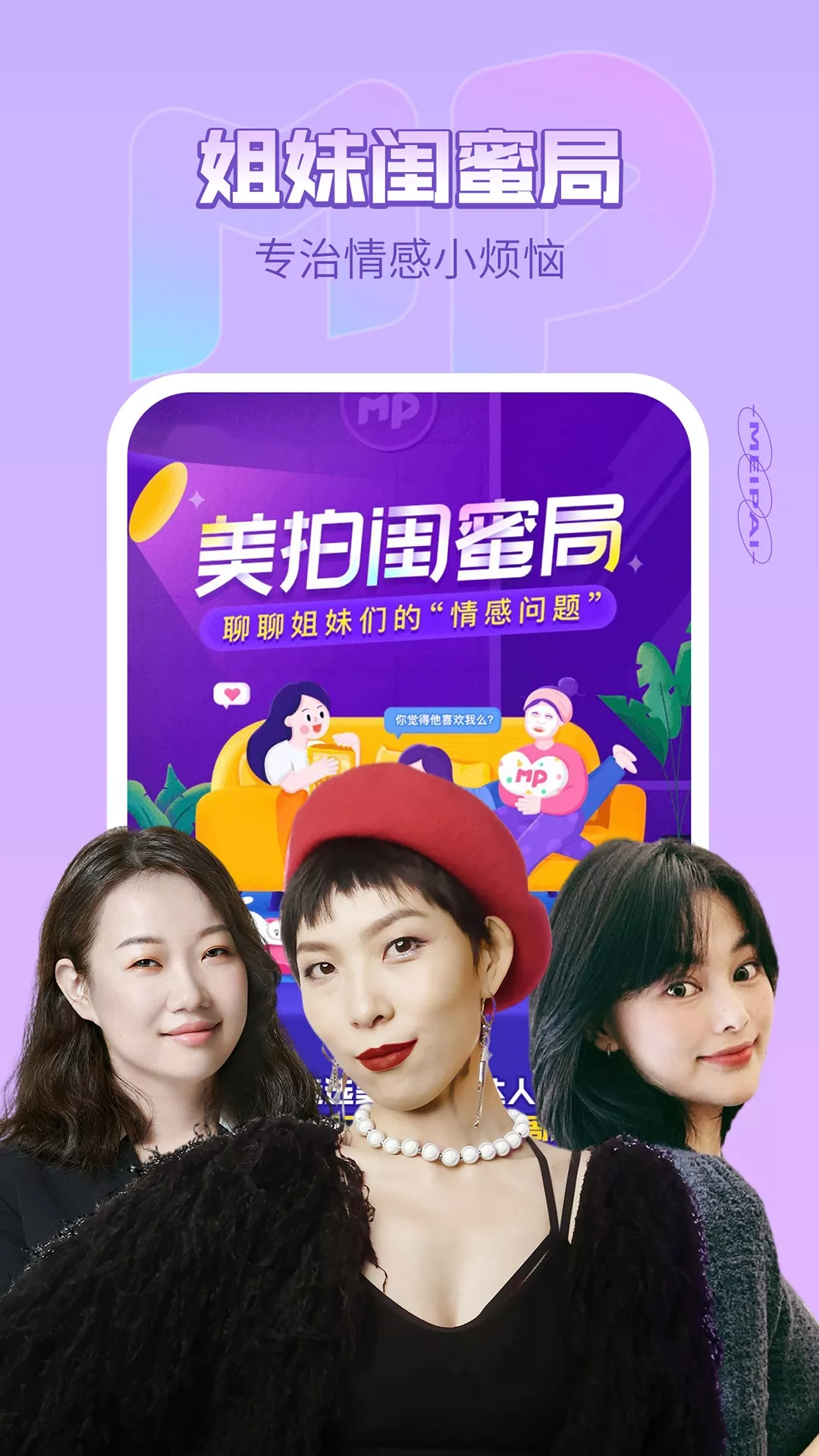 美拍 - 真实有爱的女生视频社区,分享女生间的新鲜事。 这里是闺蜜聚集地,你可以畅聊闺蜜之间的悄悄话、秘密心事。 生活烦恼闺蜜支招,情感问题姐妹倾听,美妆穿搭姐妹手把手教你, 你想说的你想学的你想看的都在这里。 - 超飒美拍达人,体验多面人生 清北美女学霸的经验分享,职场女性的开挂人生,全职妈妈的华丽蜕变等等,每一面都很美。 - 闺蜜组局畅聊,专治情感烦恼 闺蜜来组局,讨论全网流行的热点话题,吃饭睡觉聊八卦,聊聊闺蜜悄悄话:恋爱小技巧、情侣相处日常、婚前婚后生活大揭秘…… - 多元热点圈子,姐妹扎堆有共鸣 多种多样的圈子,姐妹们买它、干饭人干饭魂、生产日记、下饭爽剧、养宠生活.......遇见兴趣相投的闺蜜,来了就会迷上了。 - 拍摄剪辑神器,自然美颜更漂亮 美拍视频剪辑功能全面升级改版,人见人夸的视频美颜,0门槛打造属于你的视频,多种风格的滤镜、边框、动态贴纸和特效等。全网爆火视频玩法,一键使用同款视频模板,超多模板等你Pick! 如果你有任何的意见或建议欢迎联系我们: 官方网站:https://www.meipai.com 美拍App:“我”—反馈与帮助 期待您的建议,成就更好的我们! “美拍meipai”为厦门美图网科技有限公司的注册商标,对于任何未经我方许可擅自使用“美拍meipai”或与之近似商标的行为,我方均保留追究法律责任的权利。
