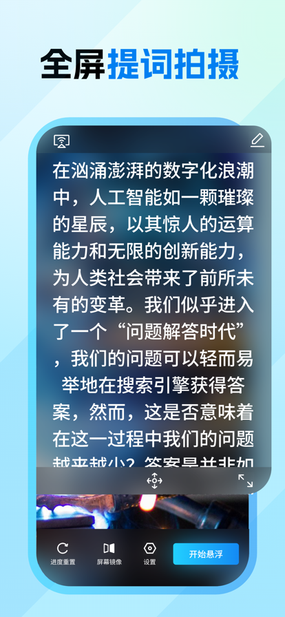 提词器台词拍摄大师-悬浮滚动专业提词助手、让您在演讲、直播、拍摄短视频更流畅,提词更轻松~ 应用特色功能: 拍摄提词:在拍摄时显示台词,不影响拍摄内容, 一边拍摄一边提词 悬浮提词:可悬浮在任何拍摄或直播App上,自动悬浮滚屏题词 全屏题词:大字幕全屏提词器,自由设置字号大小以及文字颜色 快捷导入:支持语音,图片视频,扫描文件等多种导入方式,快速制作台词 智能滚动控制:自由调节滚动速度,适应不同语速需求。 更多实用功能 自定义文字大小、颜色、背景色。 台词循环播放,适用于反复练习。 阅读提示线,防止串行或漏读。 拍摄倒计时,助你精准掌控时间。 适用场景: • 视频拍摄 • 直播带货 • 演讲练习 • 会议发言 • 课程录制• 【自动续费会员说明】 • 订阅服务:连续包周会员(38元/1周) • 付款:用户确认购买并付款后记入iTunes账户。 • 用户可以通过用户的帐户设置来管理用户的订阅和自动更新。 • 取消续订:如需取消续订,请在当前订阅周期到期前24小时以前,手动在iTunes/Apple ID设置管理中关闭自动续订功能。 • 续订:会员的自有充值账户或苹果iTunes账户会在到期前24小时内扣费,扣费成功后订阅周期顺延一个订阅周期。 隐私政策:https://cwc2u82pc7h.feishu.cn/wiki/MUp4wQb1TiCUmNkRLbNcPa7intc?from=from_copylink 用户协议:https://cwc2u82pc7h.feishu.cn/wiki/ZJp7wblfViU9V0kAqGwc86bHnfd?from=from_copylink