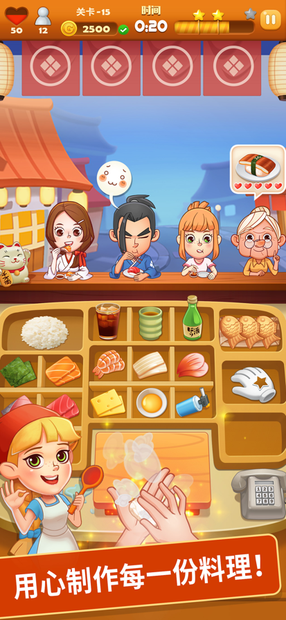 热爱美食料理游戏?不想反复切换多个APP?《烹饪大厨》完美解决你的选择困难症! 一次拥有,多重体验——融合《寿司大厨》《拉面大厨》《点心大厨》等超人气玩法,从一个游戏轻松穿梭于寿司吧、拉面屋、点心坊之间! 菜式丰富,操作上瘾——捏寿司、熬高汤、蒸点心……简单易上手的操作,搭配循序渐进的关卡设计,让你不知不觉沉浸烹饪乐趣! 画风精致,食欲大开——鲜艳可爱的美食画风,逼真动人的烹饪音效,每一道菜都让人垂涎欲滴! 挑战升级,成就满满——在不同厨房中解锁新菜品、服务挑剔顾客、冲击更高分数,成为名副其实的“全能大厨”! 无论是休闲放松,还是挑战手速与策略,这里都能满足你!
