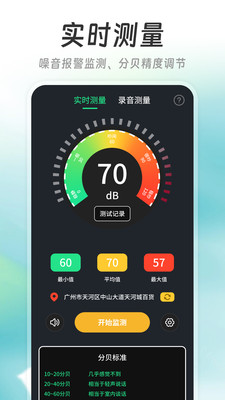 分贝噪声测试是一款可随身携带的分贝计,噪声计,噪音检测器。 分贝噪声测试可用手机麦克风来测量环境噪声分贝(dB)大小的噪声检测软件,测试时会有直观的分贝值(dB)作为参考,轻松测量出当前环境的噪声水平,更有详细的测试记录,时间、地点、分贝值、平均值等。 1.显示当前噪声水平的参考实例显示当前分贝值 2.提供定位系统,方便查看噪音记录。 3.提供标准的分贝标准参考值,方便你作出判断。 4.移动设备的麦克风主要用于记录人声,因此大噪音是有限的,它不能识别分贝值过高的声音(大多数情况下在100dB以上)。 注意:这款应用不能替代专业的科学测量设备。