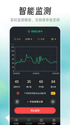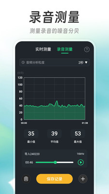 噪音测量检测仪-分贝测试仪,环境噪声音量分贝测试。高精度专业级噪音检测,快速响应分贝数值变化,A&C计权升级测试算法,噪音测试数值更加精准。噪音分贝水印相机拍照&录像,记录环境噪音分贝情况。支持噪音测量高清录音回放功能,最大分贝值&最小分贝值记录,分贝测试结果实时图表显示。无论是图书馆、办公室、学校、卧室、工厂等环境噪音检测,还是家电、汽车、机械、装修的名等设备噪音检测,分贝噪音测试都能轻松搞定,满足您一切关于工作、生活、学习等噪音检测需求。 【专业级噪音计】A&C加权噪音检测算法,高精度噪音分贝测试,理论测量误差 ±1.5db; 【高敏快速响应】实时噪声分贝检测仪,快速响应噪音分贝变化,声源高频率取样2次/秒; 【实时噪音测量】噪音分贝最大值 / 最小值显示,噪音分贝数值稳定,支持分贝数值保持; 【噪音分贝水印】环境噪音情况拍照&视频记录分享,噪音分贝数值,噪音测量地点水印; 【分贝检测记录】超长分贝测试记录保存,详细的噪音分贝信息。检测噪音高清录音回放; 【多领域噪音计】学习生活环境噪音,家电机械噪音,活动工地装修现场噪音等领域检测。