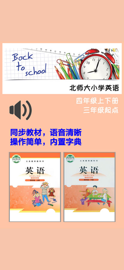 「易学堂教育」权威出品,专属课堂! - 以全科同步辅导为基础,专注培养中小学生全科学霸! 每天进步一点点,让学生爱上学习。 - 用喜欢的方式,激发学习兴趣,培养学习习惯,构建知识体系! *** 此App包括北师大版《小学英语四年级上下册》全部课程内容。 「易学堂教育」学习机是一款智能电子课本学习工具,名师家教、课本配套、同步学习、字典翻译、教学辅导全拥有! 完全同步新版教材,英语听说读写短时高频,是学生的好老师,是家长的好助手。 我们致力于让每个学生能够轻松高效学习,成绩能力双提高! 【产品功能】 - 学习利器,提分神器。 - 内容丰富,逐一掌握。 - 有效预习,复习巩固。 - 同步教材,贴心翻译。 - 词典工具,效率提升。 - 界面简洁,功能强大。 - 即点即学,随时随地。 - 目录跳转,锁屏续听。 - 语音清晰,播放灵活。 - 纯正发音,口语流利。 - 朗诵配乐,怡情养性。 *** 「易学堂教育」我们的课堂不一样。 专为3-18岁学生提供小初高全科课程辅导。 采用全新“双螺旋”教育模式,全面开启智慧教育新时代。 以“赋予孩子未来更多可能”为使命,通过打造多元产品生态,精准满足个性化需求。 先进的云计算、大数据、AI技术 - 寓教于乐,沉浸式体验 让学习成为美好体验,让学生更好地沟通世界! ■更好地学习 Better learning experience ■更好地沟通 Better communication ■连接美好世界 Connect our beautiful world 马上行动,即可开启全新学习体验之旅! 配套《北师大小学英语四年级上下册》新版教材 四年级上册: Unit 1 Signs Unit 2 Shopping Unit 3 Uncle Booky’s Study Unit 4 Bobby’s House Unit 5 At School Unit 6 Review Progress Check Vocabulary Word List 四年级下册: Unit 7 At the Restaurant Unit 8 Talent Show Unit 9 Hot Soup Unit 10 Mocky’s Store Unit 11 Illness Unit 12 Review Progress Check Vocabulary Word List