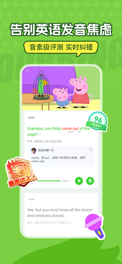 练口语就上趣配音!和1亿+小趣友一起学英语! 打通输出+输入学习闭环,让语言学习变得如此轻松好玩! AI智能学习,实时反馈+实战训练,助你告别哑巴英语! ------在英语趣配音可以做什么?------ 玩着就可以学英语! 【练口语】为经典内容配音学英语,百万素材选你选,影视剧库、热门动漫、经典动画、英文歌曲、同步教材…… 【练听力】你喜欢都可以随身听!视频一键转听力,听你想听,经典名著、必考词汇、英文演讲、历年真题…… 【背单词】百万原声视频例句,让你身临其境背单词,AI词汇私教1v1,加强词汇场景记忆, 掌握实际运用。 【同步练】教材全覆盖,预习复习两不误,萌宠AI学伴添动力,背单词、读课文、刷真题、单元测,完整科学学习闭环。 【AI语伴】AI口语陪练,中英文聊天,零基础学习,双语讲解,场景自由聊,外教一对一辅导,有趣又有聊! ------英语趣配音有什么?------ 1. 趣味形式学语言,告别传统枯燥学习法。 【看视频学】百万精彩视频,看剧学英语,与主人公原声对话,沉浸式学习! 【听歌学】经典英文歌曲边唱边学,流行歌曲、怀旧金曲、影视原声…… 【互动学】定期大赛,超多奖品等你拿,和大神切磋pk,还能邀友一起学! 【闯关学】游戏化练习,强化学习动机。知识点答疑,掌握重点难点。 【实战学】 费曼学习法,以用促学,实时任务监测,即时激励。 2. 多种趣味素材,覆盖多个领域。 【热门正版IP引入】小猪佩奇、巴塔木儿歌等官方正版授权,与主人公对话,身临其境学英语! 【多语种】全新日语、汉语的语种上线,更多语言学习选择。 【生词本】配音视频中的生词一键添加,覆盖语言学习生涯高频单词,加深单词场景使用记忆。 【多种词书】提供四六级、专四、专八、考研、托业、托福、雅思、GMAT、SAT、GRE等专业词书。 3. AI专业辅导,随时随地,在线学习。 【AI私教1v1】双语讲解,中英互译,例句引导,润色表达,打磨地道口语。 【专业打分】采用国家中高考口语打分系统,专业口语打分。 【实时反馈】音素级口语评测系统,AI智能算法多维点评,实时反馈发音语法问题并纠正。 【单词测试】可根据词书范围、数量、测试题型和时间速度进行个性化定制测试。 【能力测评】采用 CEFR(欧洲共同语言参考标准)框架体验研发英语能力测评,通过 5 分钟测试 10+道题,测出真实英语水平。 【关于我们】 英语趣配音以“让学习更有趣,让教育更公平”为使命,在教研、理念、技术等方面不断进步,通过 AI 智能学习闭环,提供面向教育应用场景的技术能力与智慧解决方案,可靠便捷的学习工具,优质丰富的教学资源,环境良好的交流社区,简单好用的语言学习平台,与用户共建健康长远的教育生态系统。 【vip会员连续包月套餐说明】 1)会员权益:给用户提供一些专属特权,包括专业评分系统、会员专享内容、提升个人曝光 2)订阅周期:一个月 3)订阅价格:每月25元 4)付款:订阅可由用户管理,用户确认购买并付款后计入iTunes账户。 5)取消续订:如需取消续订,请在当前订阅到期24小时前,手动在iTunes Store /Apple ID设置管理中关闭自动续订功能。 6)续订:苹果iTunes账户会在到期前24小时内扣费,扣费成功后订阅周期顺延一个订阅周期。 7)使用协议:https://moive.qupeiyin.com/home/article/details/id/99 8)隐私政策:https://wap.qupeiyin.cn/activity/yqPrivacy 9)会员服务协议:https://moive.qupeiyin.com/home/article/agreement 10)自动续费会员服务协议:https://cwap.qupeiyin.cn/vipAgreement