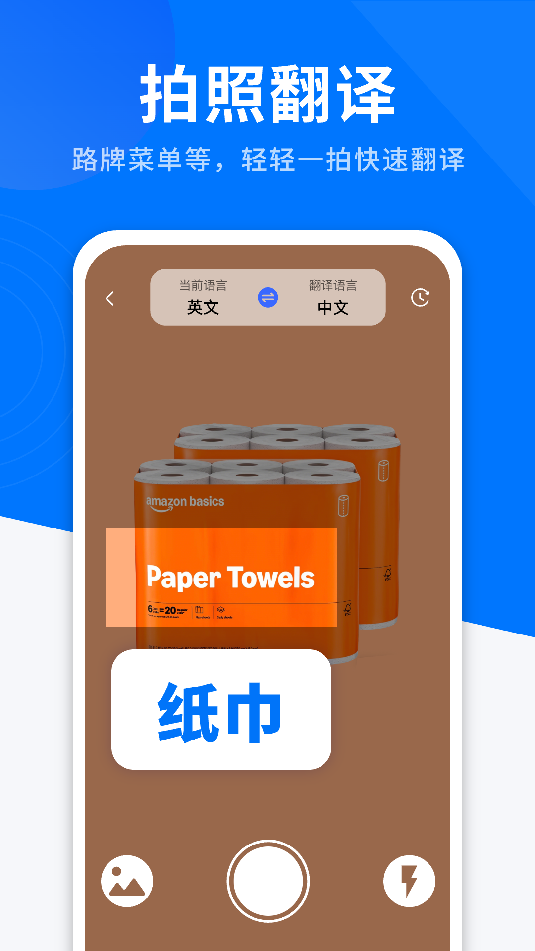 【翻译语言】<br>支持全世界114种语言实时翻译,精准翻译。<br>【产品特色】<br>大数据精准匹配世界材料,跨多行业专业级翻译。<br>【使用场景】<br>各个场合拍照翻译,学习语言,跨界办公等场景的沟通交流。<br>【主要功能】<br>拍照翻译、文本翻译、语音翻译,翻译过程更加便捷高效。<br><br>【拍照翻译】<br>无需手动输入,拍照就可以智能高清扫描图片,精准识别,极速翻译。识别及翻译结果一键朗读/复制/分享,翻译结果永久储存。<br>【语音翻译】<br>流利语音识别,随说轻松讲语音识别为文字,并自动翻译成为您期望的目标语言。可识别方言,准确率高,翻译结果质量高。<br>【文本翻译】<br>输入文字,实时获得高质量翻译内容,能够自动识别病句,整理语序,翻译结果更精准。