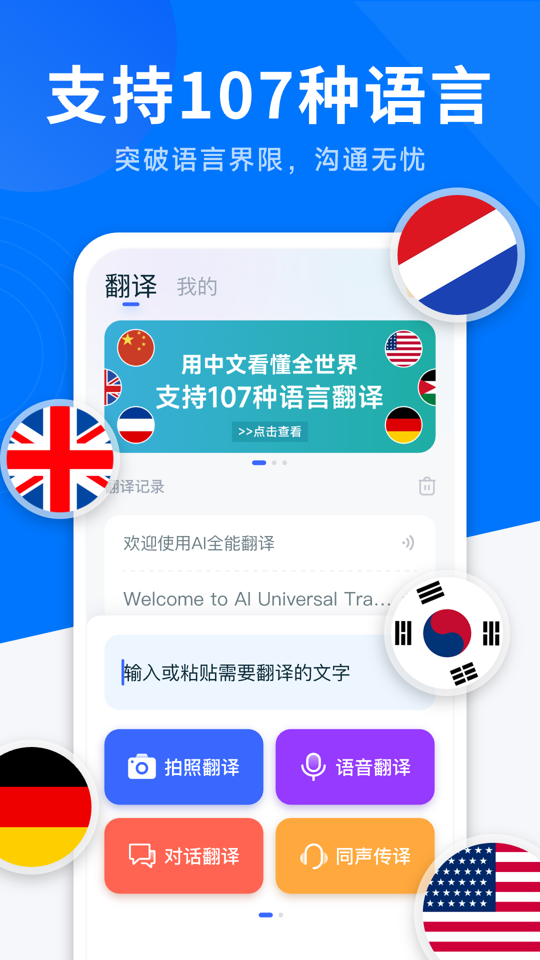 全能翻译宝应运而生,作为您口袋里的全能语言专家,集七大核心功能于一身,支持全球100多种语言的互译,致力于为您提供前所未有的精准、高效、便捷的翻译体验。<br><br>核心功能详解:全方位覆盖您的翻译需求<br>拍照翻译:随拍随译,所见即所懂<br>应用场景:面对外文菜单、路牌、说明书、书籍杂志时,只需轻松一拍,文字即刻转化为您熟悉的语言。<br><br>文本翻译:精准高效,基础却强大<br>应用场景:快速翻译任何复制的文字或手动输入的句子、段落。<br><br>同声传译:会议听课,同步无忧<br>应用场景:国际会议、学术讲座、线上网课、新闻发布会……打开功能,手机即可实时将语音转换为文字并翻译。<br><br>对话翻译:双向交流,沟通无碍<br>应用场景:与外国朋友、客户或当地人面对面交流时,您说中文,对方听到外语;对方回复外语,您听到中文。让跨语言对话自然流畅。<br><br>文档翻译:高效处理,保持格式<br>应用场景:直接上传Word、PDF、PPT、Excel等格式的文档,一键获得全文翻译版,并尽力保持原始排版,提高效率。<br><br>离线翻译:没有网络,依然全能<br>应用场景:出国旅行在飞机上、偏远地区无网络信号?提前下载语言包,核心翻译功能照常使用,确保您在任何环境下都能畅行无阻。<br><br>AI智能翻译:理解语境,告别生硬<br>应用场景:基于先进的AI大模型,不仅能提供直译,更能深度理解上下文语境、文化背景和行业术语,输出更符合目标语言习惯的、地道自然的翻译结果,告别“机翻味”。