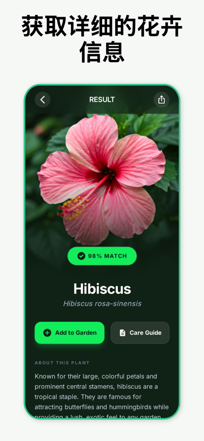 基于人工智能的快速精准识别植物识花神器APP! 只需拍摄或选取手机中的植物图片,即可快速识别植物,带你探索花卉植物! 你是不是有这样的困惑? 经常看到路边的花卉植物,却不知道他们的名字? 现在只需轻轻一拍,准确识别。 可识别上万种草木、花卉、多肉和树木。 详细介绍每种植物的特点和基本照料详情。