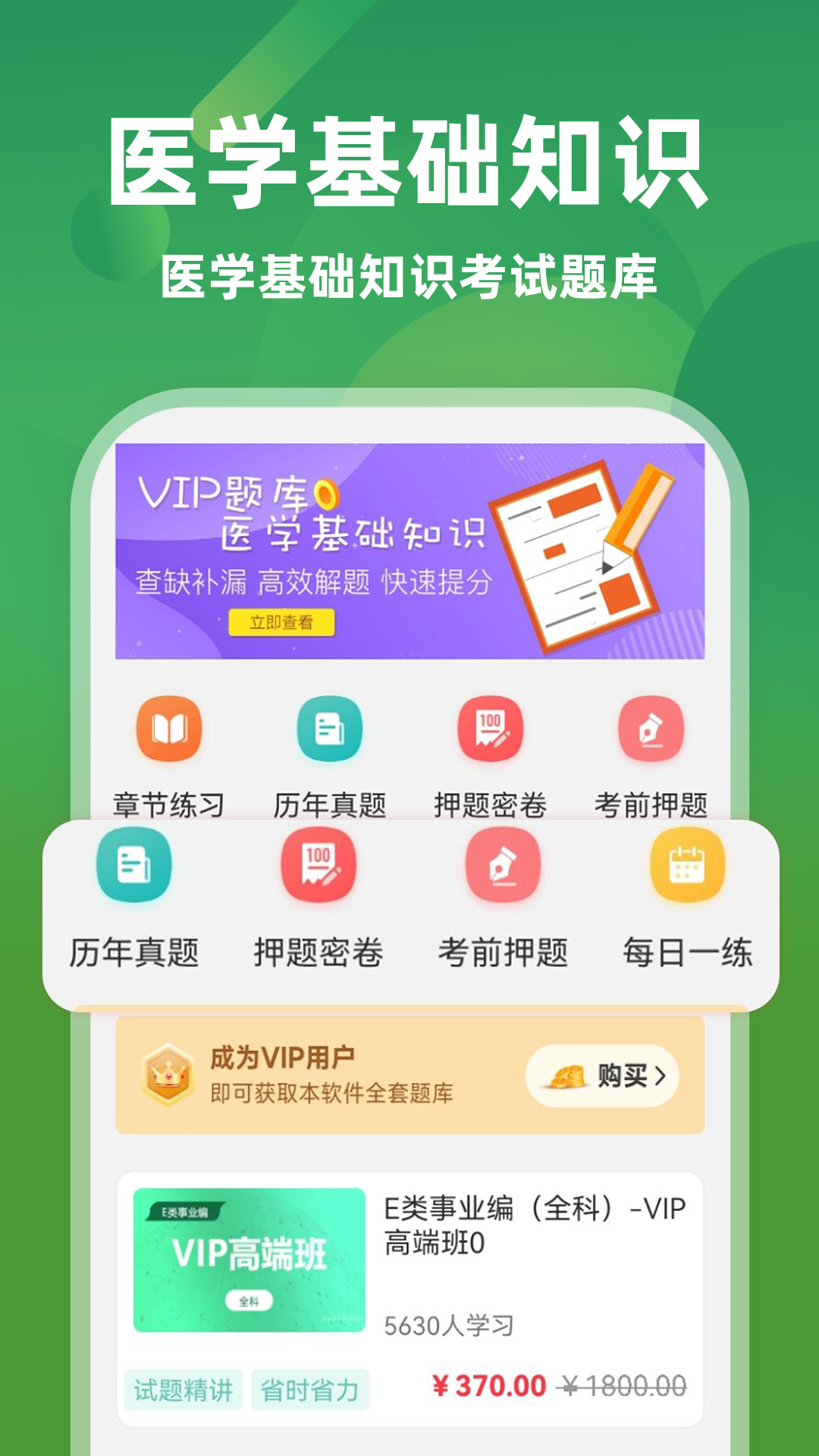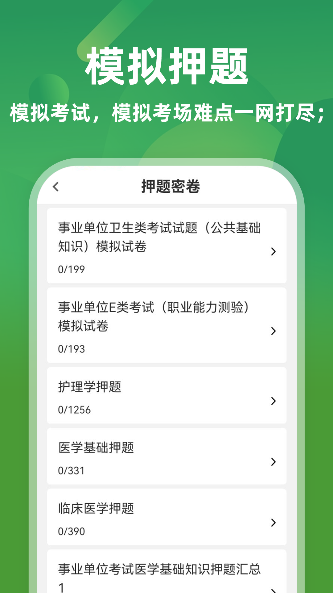 医学基础知识考试题库为医疗卫生系统公开招聘工作人员考试为准备的题库,根医疗卫生事业单位招聘考试教材大纲。含基础知识+押题密卷+智能组卷。<br><br>【基础知识】按章节练习,随时随地练习,刷题便捷,每道试题附解析;<br><br>【考点押题】高频考点+高频易错,高频题库助你快速吃通考点,举一反三;<br><br>【智能组卷】模拟考试,模拟实战考试练习,考试重点、难点,一网打尽;
