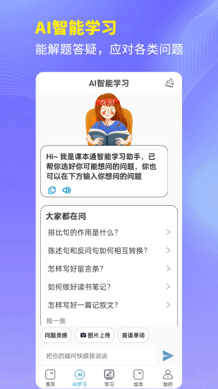 课本通小学语文学习平台,作为一款依托前沿AI技术打造的学习助手,致力于为你扫清学习与生活中的各种障碍。无论你提出什么问题或需求,它都能精准理解,并通过强大的算法迅速生成准确的答案。随着你的持续使用,它会不断学习和进化,为你提供更加个性化的学习体验。 核心功能: 1、AI智能解题 结合前沿科技与教育理念,提供全方位、个性化的解题支持,彻底改变传统学习方式。无论是数学、语文还是其他学科,AI都能快速高效地为你解答。 2、动画绘本 将经典绘本以生动有趣的动画形式呈现,让孩子在沉浸式的体验中享受阅读乐趣,告别枯燥乏味的传统阅读方式。 3、语音评测 通过智能语音识别技术,实时纠正孩子的发音,帮助孩子更自信地开口说英语,有效提升语言表达能力。 4、AI写作助手 无论是中文还是英文作文,只需输入题目和要求,AI即可生成高质量的作文范例,为你提供灵感,拓宽写作思路。 课本通小学语文,不仅是学习工具,更是你成长路上的智能伙伴,助力你在学习的道路上不断进步!