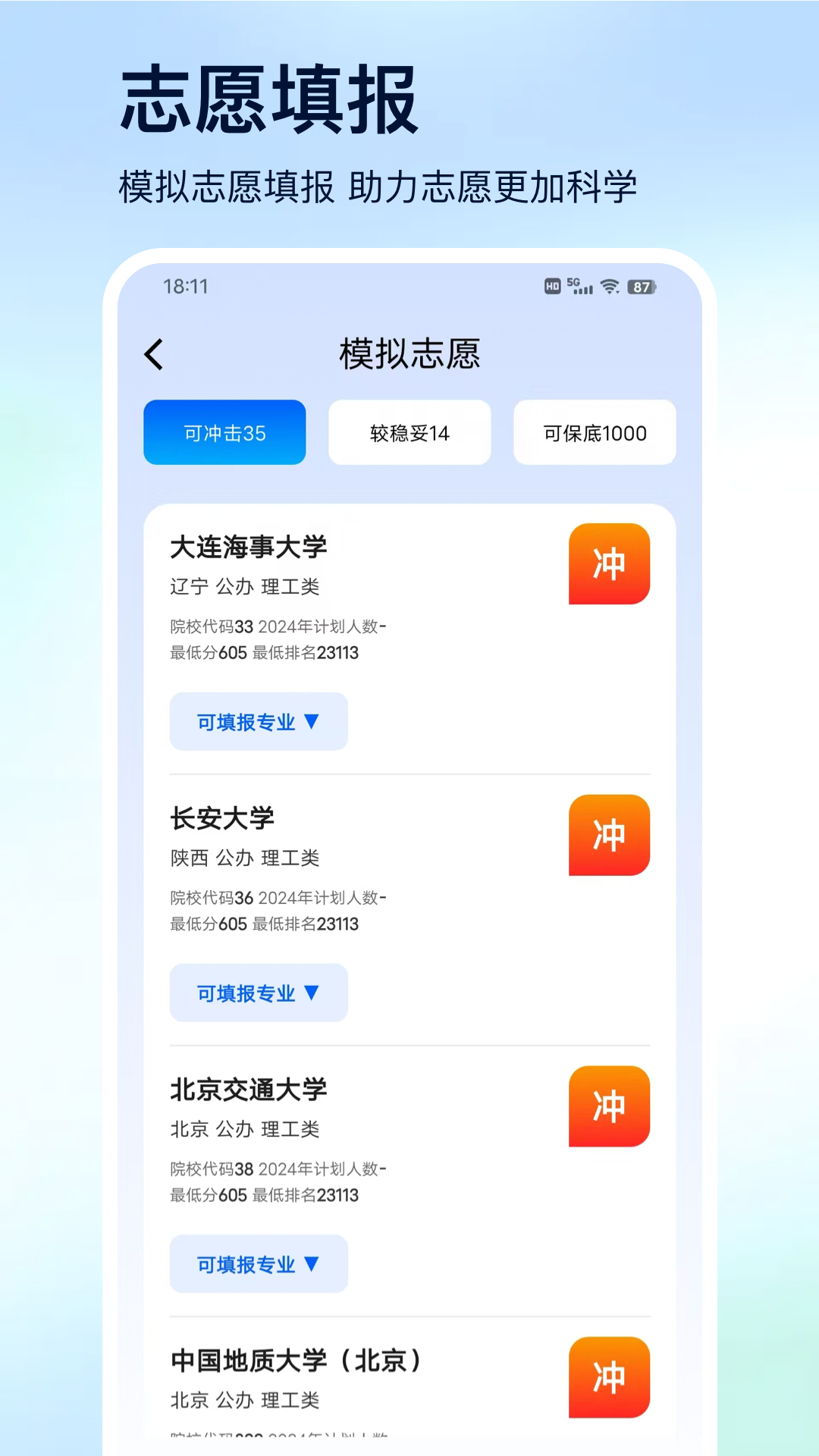 这是一款专门为高考学子定制的高考志愿填报指南,你可以在这里查询各个高校的分数线、名次线等等,协助考生和家长做出更合理有效的志愿选择。 【志愿填报】通过智能大数据分析,全面支持新高考“院校专业组”及“专业(类)+院校"的志愿填报。计算高中考生拟填报院校的录取概率,为考生提供适合的报考方案和高考志愿填报建议,助力正式填志愿不再迷茫。 【找大学】全国超3000+的高校信息,你都可以在这里找到,一键搜索查询,看看你心仪的院校信息。 【查专业】海量的专业数据解读,囊括了全国99%以上的专业信息,帮助你选到更满意的专业。 【政策查询】全国最新的高考政策公告,你都可以在这里看到。 【历届高考真题】我们帮你收集了近年来全国各地的语数外文理的真题卷,做好充分的考前准备。 【证件照拍摄】急需使用证件照也不用担心,使用手机进行拍摄,足不出户即可获得证件照,填写资料快人一步。
