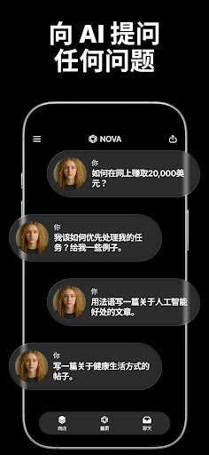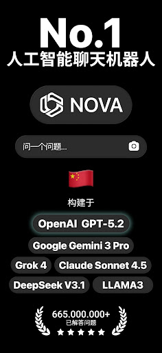 Nova 是一款革命性的 AI 聊天机器人和个人助手,基于最新的 GPT-5.2, GPT5、GPT-4、Google Gemini Pro 3、Claude 和 DeepSeek 技术构建。<br><br>Nova Chatbot 使用先进的人工智能技术,例如GPT-5.2, GPT-5,能够理解您的问题并生成类似人类的回答,让您感觉像在与一位博学的朋友交谈。Nova Chatbot & AI Assistant 甚至可以推荐一本书或一部电影!<br><br>Nova AI Chatbot 是最强大的跨平台聊天机器人,使用多种 AI 模型开发,旨在以最用户友好的方式提供最新的聊天技术。它是唯一基于 GPT-5.2,GPT5、GPT-4、Google Gemini 和 Claude 的跨平台聊天机器人应用,提供行业领先的功能。<br><br>主要功能:<br>- 基于 GPT-5.2 和 GPT-4o 的最新人工智能技术<br>- 使用 GPT-5.2 从互联网上获取答案<br>- 满足您需求的人工智能助手<br>- 无限提问和回答<br>- 多语言支持(140 多种语言)<br>- 跨平台设备支持(iPhone、iPad、Apple Watch 和网页)<br>- Nova Chatbot 可以与聊天机器人进行完整对话(AI 记住完整聊天记录)<br>- 基于 DeepSeek 构建,以增强实时信息检索和更智能、上下文感知的响应。<br><br>【 您的 AI 写作助手 】<br>使用 Nova AI Chatbot,您可以获得个人 AI 助手,用于所有类型的写作项目,无论是社交媒体帖子、论文还是诗歌。基于 GPT-5.2, GPT-5、GPT-4o 和 Gemini 的 AI 助手可以帮助完成任何任务,例如创造独特的开场白或甚至创作原创歌曲。没错!这款基于 GPT-5.2, GPT-5 和 GPT-4o 的 AI 聊天机器人应用不仅聪明,而且富有创意。让您的 AI 助手将您的想法变为现实吧!<br><br>AI 文案助手:<br>Nova Chatbot 提供基于 GPT-4o, GPT-5 的文本生成功能,可用于撰写广告、描述、销售提案和视频脚本等内容。<br>AI 内容创作者: 使用基于 GPT-5 的 Nova Chatbot 工具,为您的内容营销(博客文章、文章、社交媒体内容)提供支持。<br><br>【 精确的校对工具 】<br>基于 GPT-5 和 GPT-4o 开发的 Nova Chatbot 校对功能非常出色。<br>您的 AI 助手可以分析您的文本并提供建议,帮助您创建专业级文档。使用此基于 GPT-5 和 GPT-4o 的 AI 聊天机器人,您可以确保您的文本准确无误且完美无缺。<br><br>AI 校对:<br>Nova AI Chatbot 使用 GPT-5.2 和 GPT-5 API 开发,帮助您以任何风格和语调表达自己,同时确保语法、标点符号和拼写的准确性。<br><br>【 可靠的聊天伙伴 】<br>无论您是在寻找娱乐、建议,还是只是需要有人倾诉,Nova AI 随时为您服务。这款基于 GPT-5, GPT-4 的 AI 应用程序能够生成类似人类的回复,让您感觉像在与亲密的朋友交谈。它甚至可以推荐一本书或一部电影!<br>立即下载 AI 应用程序,随时随地拥有您的虚拟助手,基于 GPT-5.2、GPT-5、Gemini 和 Claude。<br><br>此 AI 使用 OpenAI 的 GPT-5.2 API,但我们与 OpenAI 无关。我们仅使用其官方 API。Nova AI 与任何政府或政治实体无关。AI 提供的信息仅供参考,不应被视为官方或权威信息。<br><br>无限访问所有功能<br>您可以订阅以无限访问基于 GPT-5.2 和 GPT-5 开发的高级 AI 功能。订阅将根据所选计划自动扣费。<br>使用该应用程序即表示您确认并接受我们的隐私政策和使用条款:<br><br>隐私政策: https://novaapp.ai/privacy<br>使用条款: https://novaapp.ai/terms<br><br>有问题吗?<br>support@novaapp.ai