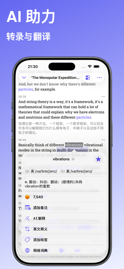 播客学语言现在支持英语、西班牙语、法语、德语、葡萄牙语和日语的学习。 为什么选择播客学语言? 就这个问题我问了问 DeepSeek,他是这样回答的: 1. 学习母语使用者的真实对话 - 您将接触到自然的英语表达,而不是教科书中的对白。 2. 无意识学习 - 您可以在通勤、锻炼、做饭等时听播客。很容易融入日常生活。 3. 改善听力 - 多听,大脑就会适应并理解快速的日常英语对话。 4. 学习语境词汇 - 单词和短语用在真实场景中,有助记忆。 5. 语音和话题多样性 - 可以找到不同国家母语使用者关于您感兴趣的话题的播客。 这几点基本概括了用播客学语言的好处,但现实是我在实践播客学语言的过程中遇到了一个痛点,那就是我的词汇量太少,而很多播客又没有提供文本,哪怕提供了文本,查词过程也会非常繁琐,于是我就做了这个 app,希望把这件事情变得简单一些。 我无法给你证明这种学习方法是科学有效的,也无法给你任何学习成果层面的承诺,我想这可能只是一个尝试,我希望能找到对这个“方法”感兴趣的用户,能够从他们那里获得一些认可或者建议,也希望给那些已经在尝试通过这种方式学语言的朋友一个好用的工具。 Privacy Policy: https://josscii.github.io/aisten/privacy.html Terms of Service: https://josscii.github.io/aisten/terms.html