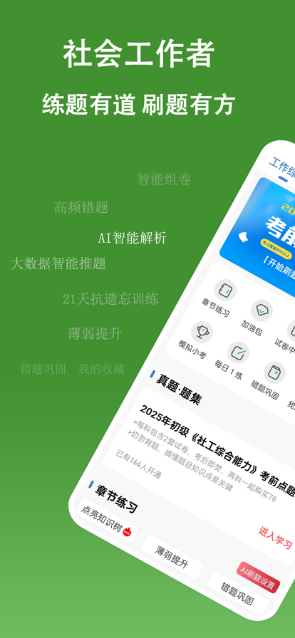 社会工作者考试备考刷题软件! 高端班助学 + 海量题库 + AI助教,三位一体备战社工! AI助学焕新上线,章节刷题严格依据社会工作者考试大纲,AI智能推题精准定位薄弱环节,结合艾宾浩斯遗忘曲线研发“21天抗遗忘训练”,让考点过目不忘! 社会工作者考试题库是考生专用的实现科目练习和模拟考试的手机端APP软件,集智能辅导、题目解析、AI智适应学习和考试考情于一身,涵盖该考试热点、难点和常考点,有社会工作者考试的各个科目的历年真题集、模拟题集、章节练习,每个科目独立,结合AI智能刷题、解析拓展、错题巩固、模拟考试等多维模块,助你查漏补缺,是各位考生学习备考的帮手。 【产品功能】 >>练习: 【章节练习】题库内所有科目的章节题目均可随意练习。 【历年真题】收录近几年社会工作者考试真题,与考试亲密接触。 【高频题目】大数据分析高频考点与易错题,精准推送专项强化训练。 【错题巩固】自动生成专属错题本,支持题目反复练习,攻克薄弱环节。 【AI智能推题】基于能力评估报告,推送薄弱知识点+顽固错题+抗遗忘特训题。 【模拟考试】模拟考场环境,智能组卷、计时评分,提前适应考试节奏。 【学习资讯】备考技巧、复习技巧,尽在社会工作者练题狗。 【指南与支持】 ·备考资讯、招考通知、复习技巧一站式获取 ·随时学习、多端同步,碎片化时间高效利用 【技术支持】鼎维云课堂 【联系我们】 微博:@练题狗 微信:liantigouapp 客服电话:+8618290463382 (工作日9:00-18:00)