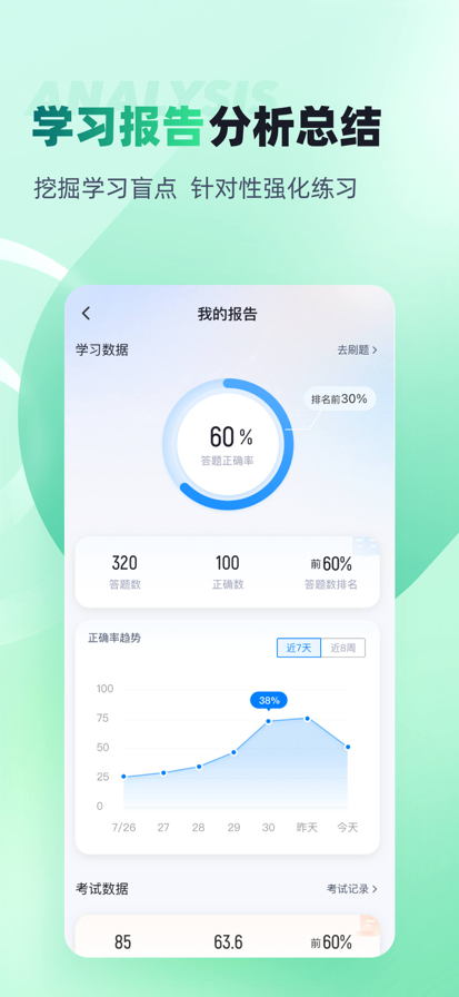 这是一款为用户提供职称考试学习辅导,覆盖建筑工程类,财经类,医卫类,资格类,公务员等多个科目,满足不同职业需求的在线学习平台。 主要特点: 1.题库:汇集考点和易错点;配合历年试题,把握方向;有考点集锦,考试练习。 2.视频解析:精讲课,同步官方教材,从基础抓起,更有视频解析题目,以题带点。 3.随时随地:满足碎片化的场景需求,随时随地,想学即学。 4.报考信息、行业动态、题库内容等及时更新。 5.学习报告功能,科学掌握学习情况,了解自身备考水平,及时查漏补缺。