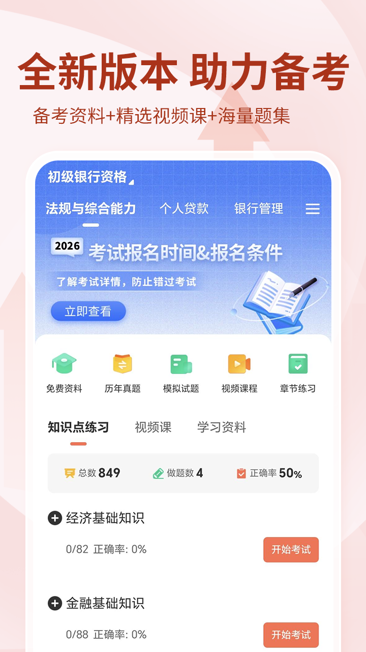 2026年银行从业资格考试力荐题库! 银行从业资格学员考证都在用的备考APP,马上下载去体验! 专为银行从业资格考试学员精心准备的考试配套题库,内容涵盖:精选题库、强师讲解、章节精讲、高频考点、高频易错、历年真题、冲刺密卷等多个模块,随时随地学习、省时省力备考。 考完银行从业资格证后可以做什么? 银行业专业人员是指在银行业金融机构从事前、中、后台业务及管理工作的专业技术人员。通过银行业专业人员职业资格考试,取得相应级别和类别职业资格证书的人员,表明其已具备从事银行业金融机构相应级别专业技术岗位工作的职业水平和能力。 银行业专业人员资格考试水平评价分为初级、中级2个资格级别。 银行从业资格考试设《银行业法律法规与综合能力》、《银行业专业实务》2个科目。其中,《银行业专业实务》下设《个人理财》、《公司信贷》、《个人贷款》、《风险管理》、《银行管理》5个专业类别。 【2026年银行从业资格考试 升级题库】 精选考题,超全考点,重难点解读,助力提升,效率通关! 【2026年银行从业资格考试 强师讲解】 银行从业资格考试研究专家视频解读2026年银行考试备考策略,强师高效教学,紧抓重难点! 【2026年银行从业资格考试 章节精讲】 根据2026银行考试大纲及官方教材修订补充,从基础抓起,章节考点课程精讲,更有对应章节练习题及视频讲解! 【2026年银行从业资格考试 高频题库】 银行从业资格考试高频考点+高频易错,深入解析,助你牢记常考、易错点! 【2026年银行从业资格考试 历年真题】 全套历年考试真题汇总,以题带点,加快掌握2026年银行从业备考规律! 【2026年银行从业资格考试 冲刺密卷】 全套2026银行从业备考试题,模拟实战考试练习,详细解读考点,掌握考试精髓,助你拿证! 【千万准题库用户陪您一起备考银行从业资格考试,24小时来网校学习】 官方网站:http://www.wangxiao.cn 投诉/建议邮箱:800@wangxiao.cn