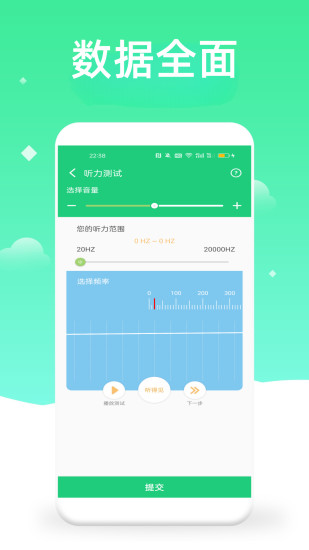 这是一款可以在手机上为自己体检的应用,功能十分的齐全,让您全方位的为自己健康做一次体检。主要功能有: 1,视力体检:包含了视力表,视力检查,色盲测试,散光测试,颜色敏感度等。 2.听力检测:为你听力提供20HZ~20000等频率,为您更好的测试听力。 3.呼吸频率:通过光电测试,话筒测试等功能就可以测试您的呼吸是否正常。 4.心理测试:包含了各种测试:抑郁症测试,情绪测试,抗压测试,自闭症测试,性格测试,情感测试,成功测试,另类测试。 温馨提示,测量的结果可能会因为手机的型号不同而出现差异,仅供参考,如有健康问题,请及早就医。祝您一生健康。