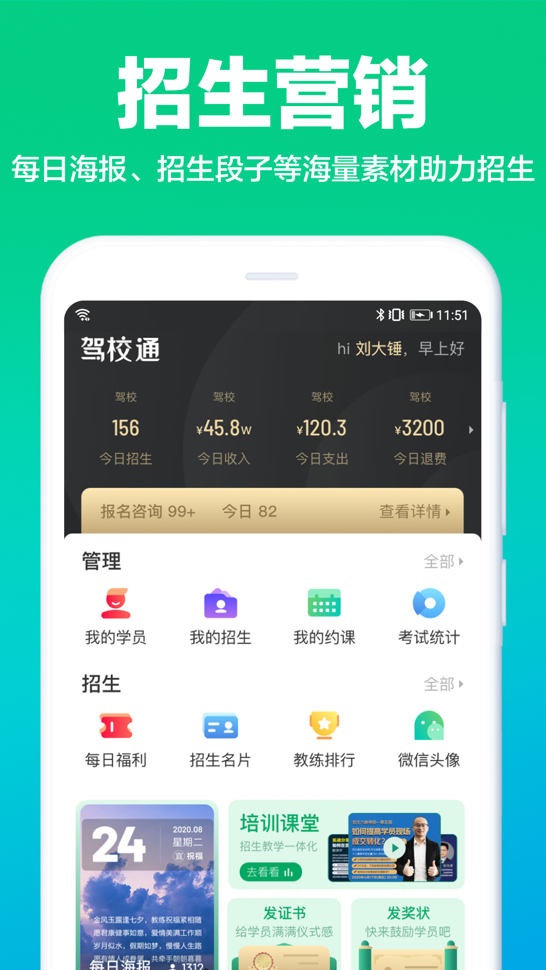 驾校通是一款为驾校和教练量身定制的集招生推广、教学培训、统计报表、运营管理为一体的产品,是驾校和教练的移动管理平台和招生工具,致力于帮助驾校及教练解决招生难题,提升教学水平、管理效率和服务质量。 产品功能 【驾校管理】驾校通移动管理平台,学员档案、招生统计、考试记录、财务报表、员工绩效等实时掌握。 【约课管理】预约培训智能化管理,学员预约、教练排课多种模式,教练实时获取课程安排,教学培训更高效。 【招生通】品牌招生服务,专属特权独家推送意向学员,智能精准匹配,真正解决招生难题。 【报名咨询】整合潜在意向学员、销售跟进全流程管理,轻松提升招生转化和业绩。 【营销推广】招生名片、招生海报、招生段子、限时特惠、优惠券等素材一键获取,随时分享转发。 【教练服务】注册教练官方认证,平台免费展示,教练可收到驾校一点通的学车学员信息,帮助教练招生。