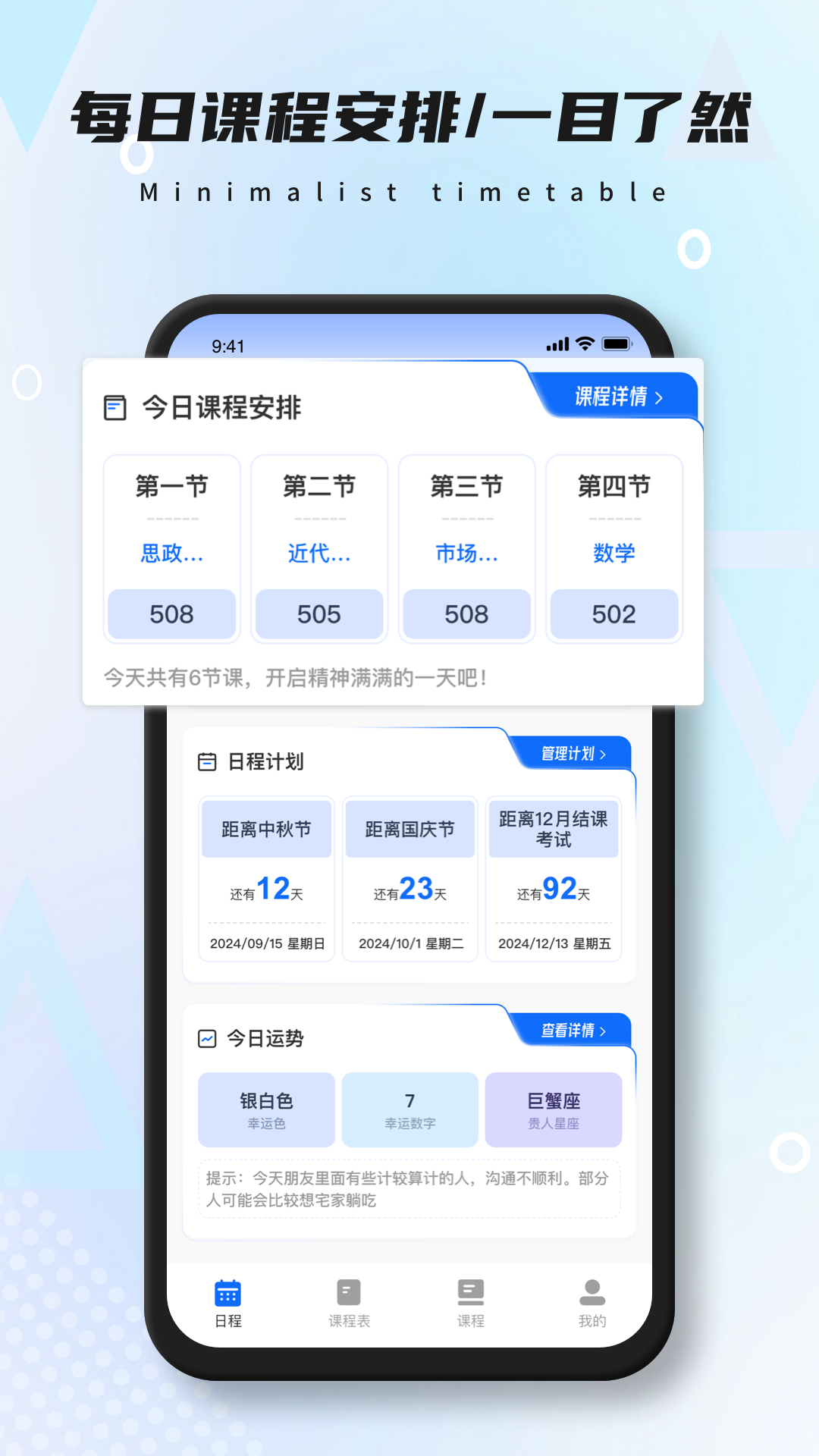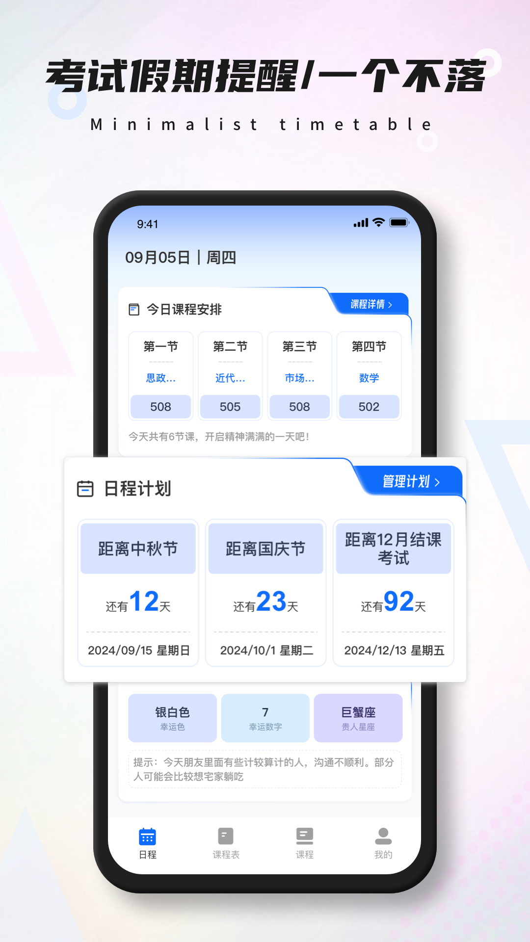 从零开始,重新出发,2024全新课程表APP正式上线 APP会提供以下功能特性: ## 课程表设置 1.可自由设置早晨,上午、中午、下午、晚上各阶段课程数量 2.可自由设置每节课上下课时间 3.可自由设置是否显示授课教师姓名、上课地点 4.可自由设置是否显示周六、周日 5.可设置每个学期的周数及当期周 6.支持多个课表 7.支持课表分享和导入 8.支持对课程表一键配色 9.支持手动调节课程高度,让每个人的课表展现趋近完美 ## 课程设置 1.批量可视化编辑,5分钟搞定一周课程表安排 2.可自由设置每门课程的背景色和文字颜色 3.可设置每节课上课地点 4.可设置每门课程授课老师姓名 5.可设置每节课上课的周数、如全部、单独、双周、指定周 6.支持重叠时间段设置不同的课程 7.支持快速复制和剪切课程 ## 其它 1. 没有广告 2.桌面小组件 3.课程提醒