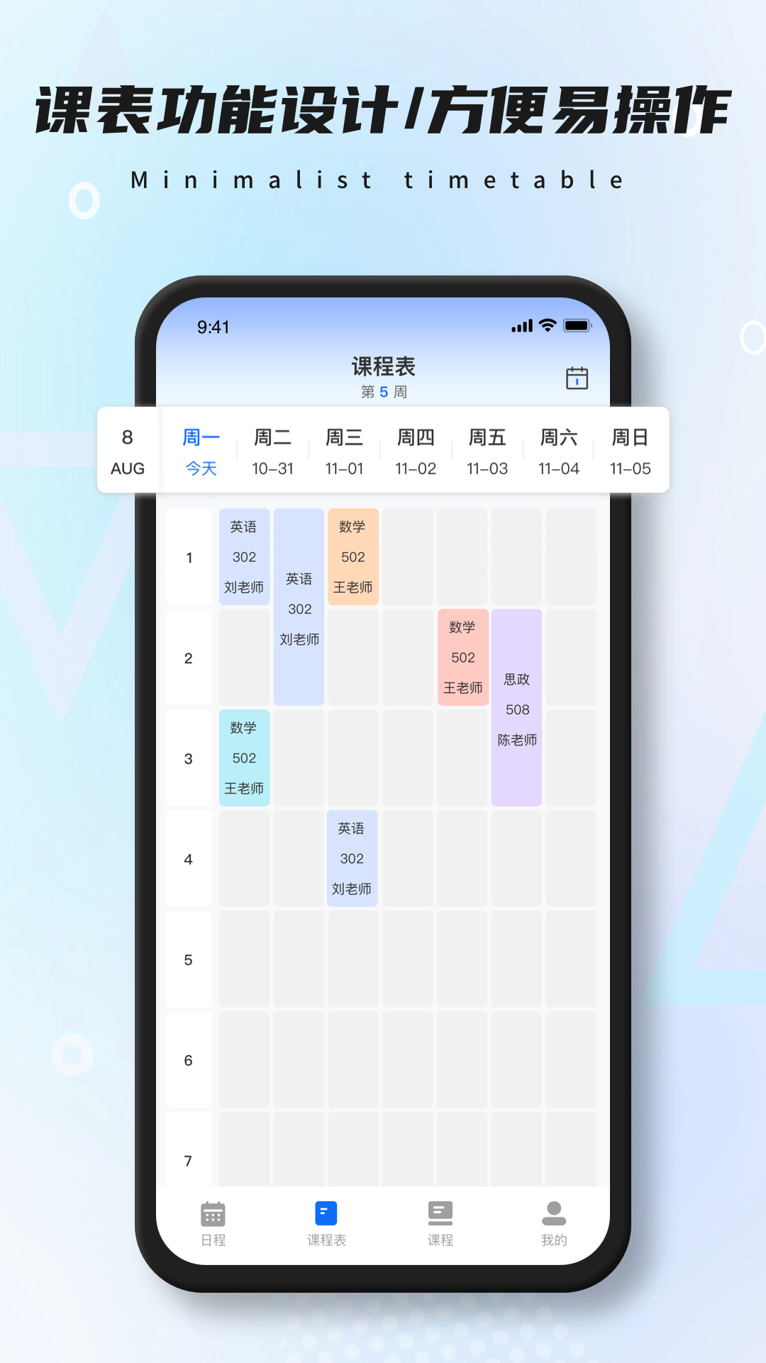 始终坚持极简风格,并支持大学生、研究生、教师一键导入课表 为广大师生提供一个功能强大的课程表app,特别受大学生同学喜爱,适配高校的课程导入 拥有丰富的自定义设置 打造专属自己的个性课表 愿每个用户都可以轻轻松松制作一个属于自己的课程表