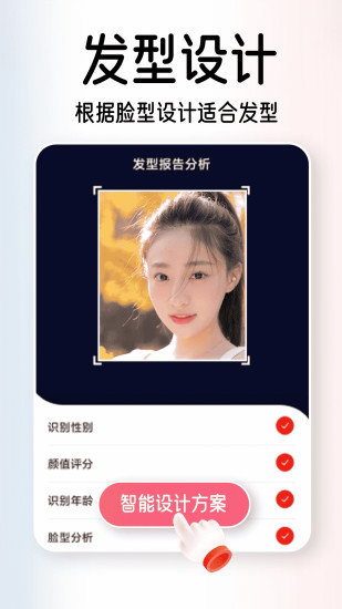 脸型分析为测脸型、脸型测试、颜值测试、颜值打分、测颜值软件,智能脸型、颜值测试分析神器。还可以进行发型模拟、试发型、测脸型、测脸型配发型等多种特效功能,用手机相机即可测试发型、一键换发型、变发型、设计发型、看发型图片、测脸型配发型、发型设计与脸型搭配。 脸型分析是一款脸型测试识别软件。智能脸型发型分析系统,仅需上传照片或拍照,就可以进行测脸型、颜值测试、脸型识别、颜值打分,根据脸型测试年龄,还可以测颜值。人脸识别,能快速测出你是什么脸型。通过颜值和年龄分析,让你每天都颜值在线,元气满满。 【颜值测试】 通过脸型分析智能系统,能快速精准的脸型识别分析。通过脸型分析智能系统,能快速高效的为您的颜值测试和颜值评分。 【试发型】 通过智能AI进行脸型分析,使用此功能测试识别脸型的分类,分析脸型特征,专业数据解决发型设计与脸型搭配问题。智能人脸识别,拍照或选择照片,一张正脸照即可尝试多种款式发型,男士发型、女士发型、学生发型、女生发型、短发造型、刘海发型、新娘发型等,需要换发型、测试发型是否适合自己,按下拍照按钮即可自动匹配发型,简直不能再简单。 脸型分析,不仅有多种测试评分功能,还能为用户带