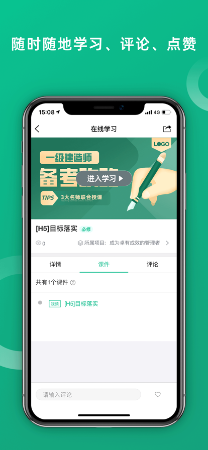 该APP通过课程在线学习,学员在线评测,学习资源分享,师生在线交流等多项功能,实现培训过程前、中、后的整合,通过移动学习随时随地进行培训,通过短视频和学习积分等形式鼓励学员碎片化学习,持续性学习,缓解工学矛盾,同时助力线下培训组织举办,提升企业员工业务技能绩效,有效解决培训落地问题。