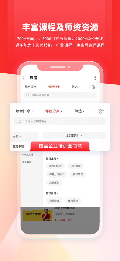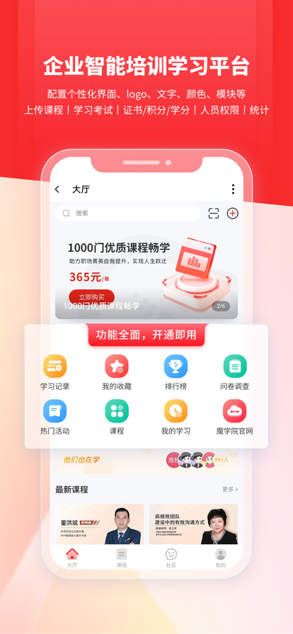 产品介绍 职行力企业培训系统,不仅包含功能全面、体验优异的企业在线培训平台,更着重扩展了知识运营、行业化赋能产品,帮助企业建构从知识运营 - 企业学习 - 能力提升 - 业务提升的企业员工赋能闭环。并独创包含积分商城、活动运营、五重激励体系在内的意愿度运营系统,有效激发员工学习、工作积极性,建设一个高活跃、高绩效的企业大学平台。 优势和价值 1.将员工当“顾客” * 良好的用户体验,以及独创意愿度运营系统,让员工从被动为主动,激发员工学习、工作的意愿度,激发企业创新力和组织活力; * 企业人才数字化管理,也就是将员工学习培训、能力全部数据化,从而形成企业能力的数据化,让企业人力资源真正的数字化,全方面掌握企业各个维度的能力资源,以数据为依据,管理企业的能力资源。职行力企业学习平台,目标就是将企业全员学习培训数据化、能力数据化,从而形成整个人才体系的数字化。 2.将学习内容当“货品” * 千人千面的用户体验交互体系,个性化为员工推荐学习内容,让员工每一次打开都能看到自身喜欢的资讯、学习课程、知识等,在帮助员工主动学习的过程中,贯彻落实企业的业务标准体系; * 整合互联网行业资讯、大咖专栏、企业知识萃取体系等知识运营,为企业源源不断带来行业知识,实现经验沉淀、萃取,打造行业权威知识平台。 3.构建“成交”场景——能力提升效果保障闭环 * 通过新员工快速胜任、人才梯队培养等场景化员工训练体系,将培训流程化、高效化; * 整合企业学习、行业化赋能产品一体化运营平台,实现了在业务场景中赋能,在赋能中业务实践的双向整合。实现了从企业学习 - 能力提升 - 业务提升的闭环。