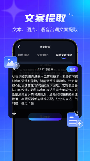 说说提词器是一款专业悬浮提词、记词的工具,专门为douyin短视频创作者、直播达人、up主们提供的创作神器。 悬浮窗提词可以搭配各大短视频、直播App使用、编写好文稿内容,实现自动滚动播放、轻松解决录制视频时忘词的烦恼,高效准确表达,极大提高录制效率。适用于短视频、网课直播、vlog记录、会议演讲等多个场景的使用。 「AI语音提词的提词器」 台词跟着语速走,台词智能滚动,根据语速控制滚动,随意穿插文稿外内容,已读未读进行区分,台词一目了然。 「万能悬浮窗的提词器」 开启悬浮,可搭配任何应用同步协作使用。相机、直播App,同样支持边拍/播,边看台词,悬浮窗可随意,拖动到屏幕任意位置,靠近摄像头,让拍摄视频更上镜,更自然,不再会有因看台词眼神偏离的尴尬现象。 「角色台词自动区分」 支持台词分角色进行对话区分,可添加多个角色,用标签及颜色进行区分,角色对话更轻松。支持快捷录入角色台词,文稿中编辑好角色编号,一键导入,高效自动识别,台词录入更省心。 「专业语音录入台词」 采用智能语音识别技术,准确将语音转换为台词,便捷文字编辑,大大提高台词记录效率。 「文本导入/转化」 支持word / txt文件文档直接导入,几秒钟即可自动提取文本中的台词,不再担心台词字数太长而手动输入,解放双手,省时又省力。 「一键视频提取台词」 支持MP4、AVI、3GP、RMVB、WMVB等多种格式视频一键提取台词,等待几分钟即可输出一套精致的文案。 「台词文件夹管理」 增强台词文件管理功能,台词文本可移动到任意文件夹内,台本分类管理更得心应手! 「提词悬浮/面板自由设置」 悬浮窗、题词板支持自定义调节面板宽窄大小,台词字体的大小、颜色、滚动速度、背景透明度。更有参考线、延迟播放、已读区域标记等辅助工具。
