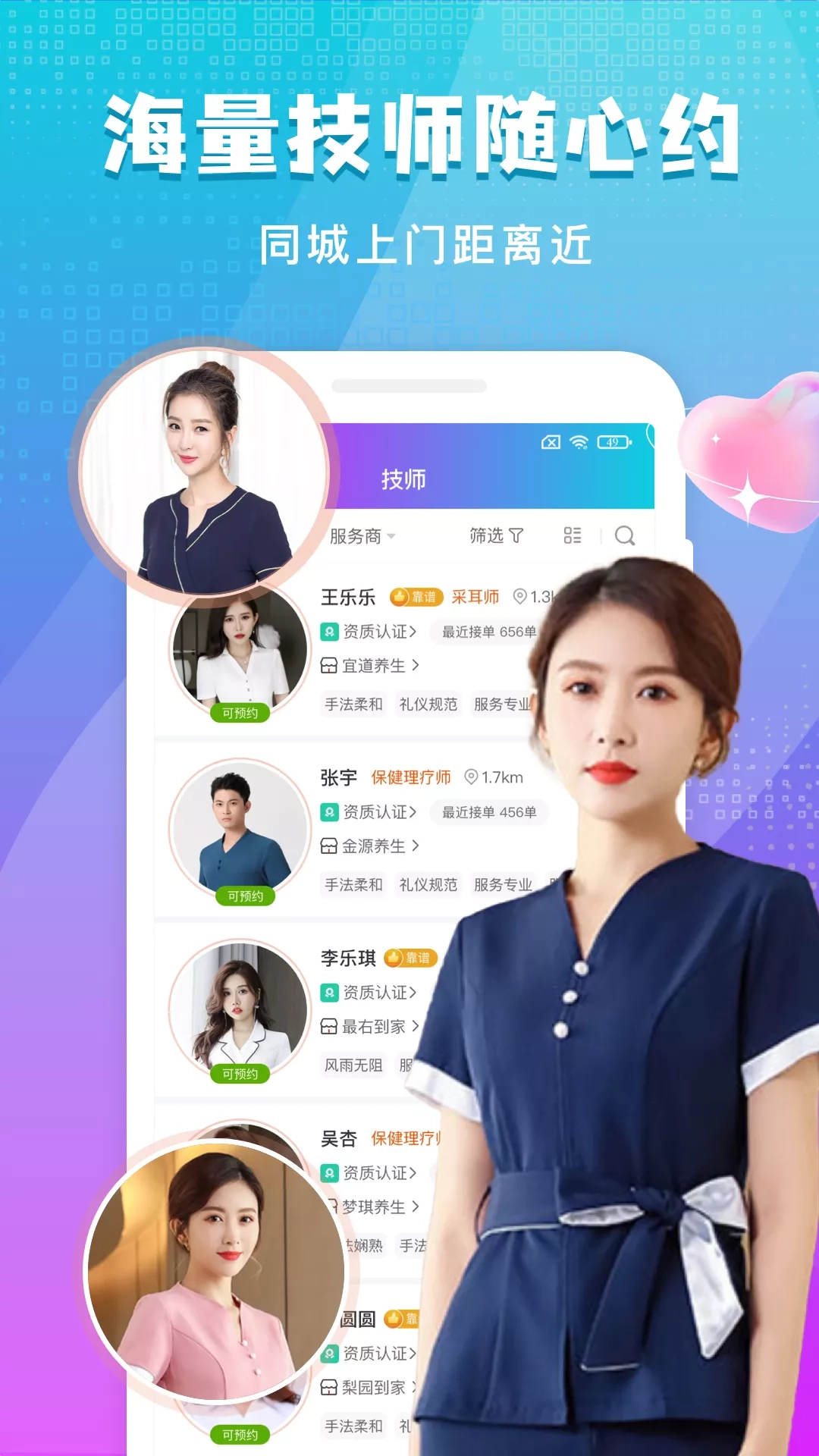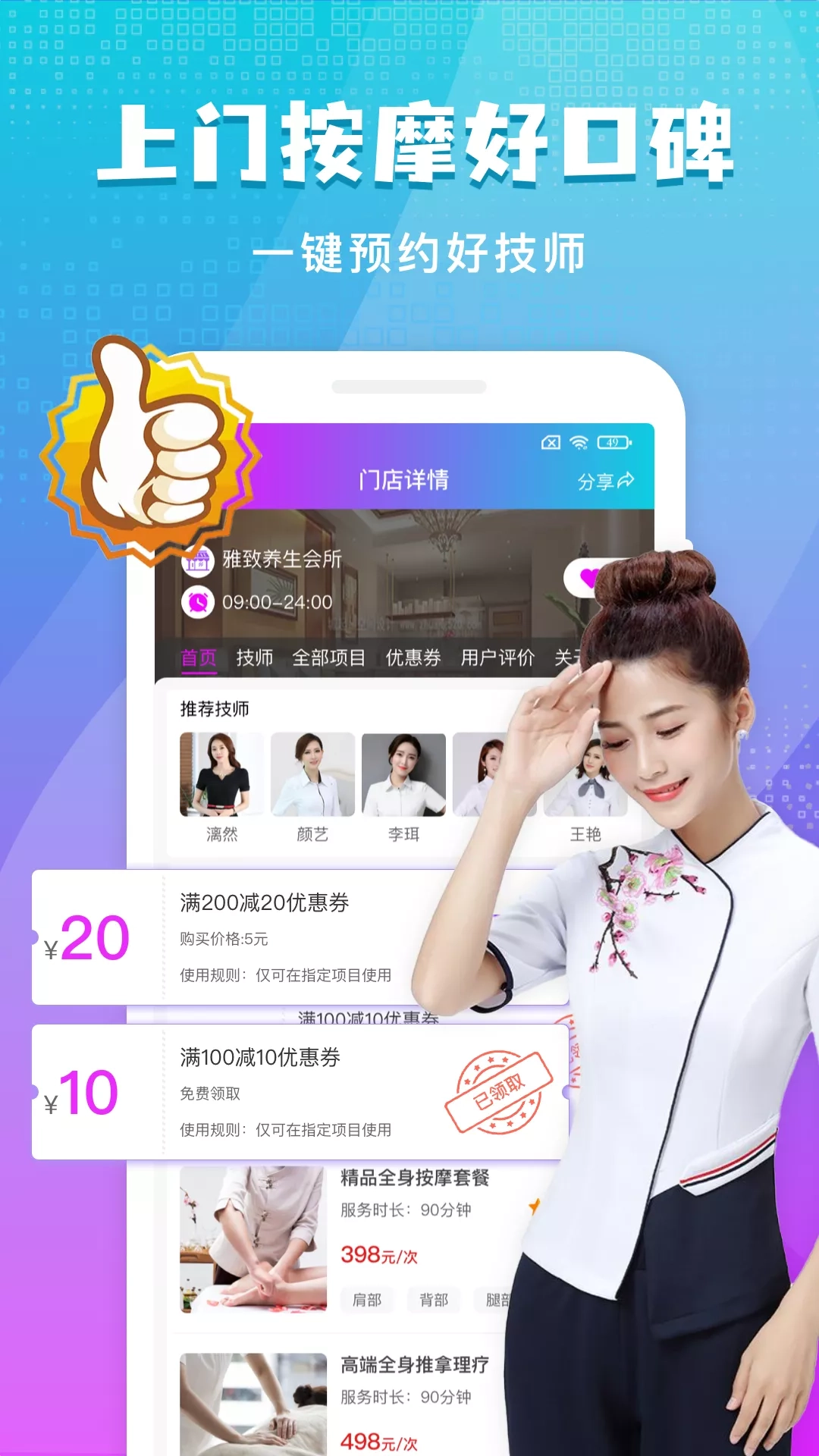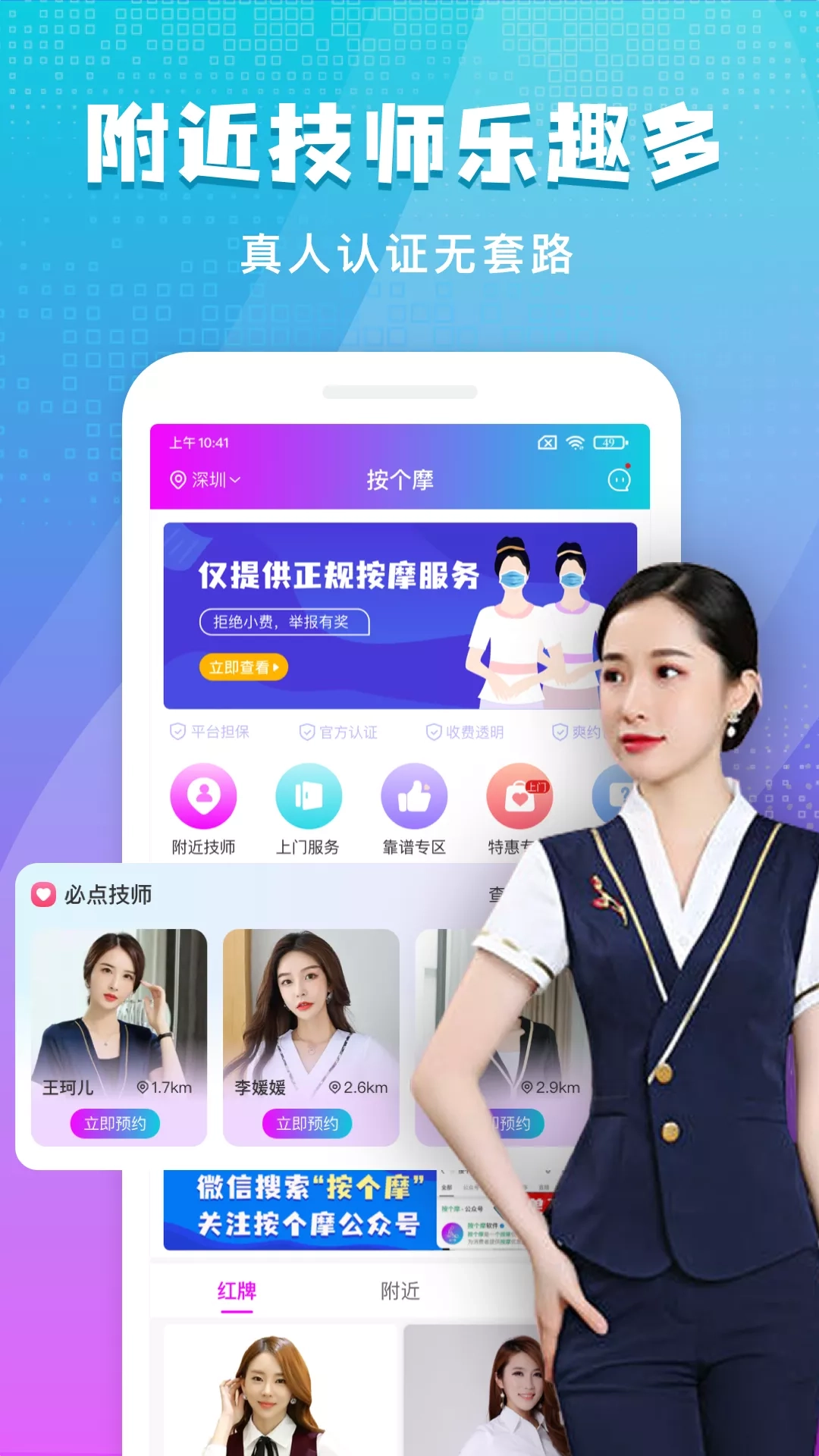 按个摩是一个交易撮合平台,按个摩致力于为用户预约心仪技师,为用户提供按摩优惠,为用户提供交易保障。支持到店按摩和上门按摩,按个摩以客户为中心,连接本地优质商户,连接本地附近技师,为用户提供高品质的按摩服务体验。可随时随地预约附近技师上门服务。 【服务项目】 包含中医推拿,油压按摩,足疗足浴,采耳刮痧,艾灸拔罐,保健理疗,经络调理,经络理疗,肩颈按摩,精油按摩,精油开背,全身推油,美容美体,清肠排毒等按摩项目。 包含中式按摩,港式按摩,美式按摩,欧式按摩,日式按摩,韩式按摩,泰式按摩等按摩手法 【平台优势】 1、平台担保:平台担保交易,资金和人身安全有保障 2、收费透明:价格透明,明码标价,全程无额外费用 3、爽约包退:商家或技师原因爽约,无理由全额退款 4、认证商家:平台精选优质服务商,服务质量有保证 5、认证技师:所有技师通过头像认证,通过真人实拍