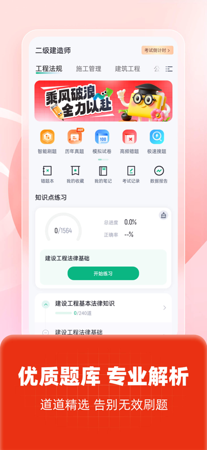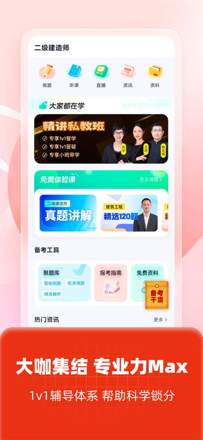 二级建造师考试聚题库——高效备考利器 精准攻克国考证书 面向施工管理人员、工程技术人员、建工专业考生,备战二级建造师执业资格考试(法规+管理+实务)。深度整合住建部最新考试大纲及核心资源,提供真题实战、系统训练、视频精讲一体化方案,助您一年三科高效通关。 核心功能特色: 真题模拟考试 收录近五年二建全国真题及权威预测卷,严格依据2024年考试大纲命题。全真模拟机考环境,支持: 分科模考(法规/管理/6大实务方向) 全真联考(三科限时模拟) 考后生成智能诊断报告:精准标注薄弱章节(如进度管理得分率)、高频错误类型(如索赔流程误判)、命题盲区(如新安全生产法条款)。 系统知识点练习 科学分类三科核心模块: 法规科目:建筑法核心条款、招投标流程、工程担保制度、民法典合同编要点。 管理科目:横道图/网络计划技术、成本控制方法、安全应急预案编制。 实务科目: 建筑工程:基坑支护验算、大体积混凝土施工 市政工程:管道施工工艺、桥梁支座安装 机电工程:设备吊装方案、通风系统调试 支持按高频考点(如双代号网络图计算)、易错点(如事故等级划分)、重难点(如专项施工方案论证)专项训练。 高清视频课程 特邀一线建造师与培训名师系统精讲: 法规重难点:新安全生产法责任体系、工程总承包风险分配 管理实操点:赢得值法成本控制、施工现场平面布置原则 实务案例课: 施工动画演示:模板支架搭设/钢结构吊装 案例拆解:质量事故处理流程(附现场图) 考点预测:2024年新教材变更解读(装配式/智能建造) 通过3D施工工艺演示+真题案例剖析,攻克实务操作盲区。 核心优势 权威精准:同步住建部2024年考试大纲及《建造师执业标准》 高效闭环:真题检测水平→视频攻克难点→练习强化记忆 实务导向:课程直连施工组织设计、现场验收等真实场景 适用人群:施工单位技术员、监理工程师、工程咨询人员、建工专业考生。立即下载《二级建造师考试聚题库》,系统攻克三科重难点,夺取建造师执业资格证书!