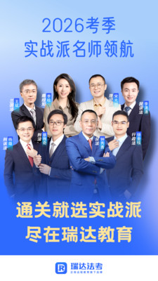【瑞达法考梦之队】 民法-钟秀勇、刑法-蔡雅奇、刑诉-杨雄、民诉-李潇潇、行政-徐金桂、商经知-李晗、理论-宋光明、三国-王斌。 【在线学习更轻松】 1.名师授课,全新公开课随意听 刑法、民法、刑诉、民诉、行政、三国、商经、理论 各个阶段课程名师带你学 2.网络直播课,法考学习更灵活 专业讲师带领学习,轻松掌握法考知识重难点 导学师全程陪伴,一对一贴心服务 3.答题训练,主观题在线AI阅卷 新考点、新试题及时更新 客观主观真金题库随意刷 4.快捷提问,答疑更便捷 专业法考讲师解答,快速扫除盲点! 热门问答、精选问答,你关心的答疑一览无余 5.课程支持离线下载 课程下载到手机里 随时随地听课,不让蜂窝网络流量限制你的学习 6.学习报告,了解学习情况,掌控学习时间 听课时间、听课天数、听课排名 让数据帮助你分析学习成果,不甘为人后 【联系我们】 新浪微博:@瑞达法考教育@瑞达法考APP 官方微信:瑞达法考 客服热线:400-1660-360,400-0388-360