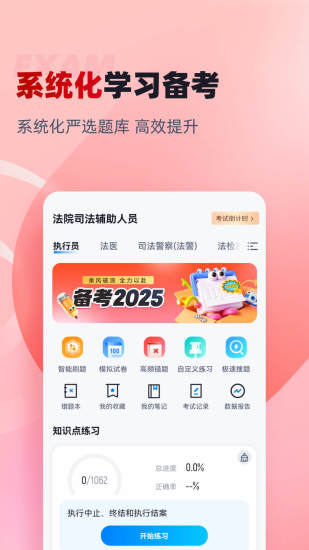《法院司法辅助人员考试聚题库》——您的专业备考助手 全面覆盖法院书记员、法医、司法警察(法警)等职位考试内容,整合历年真题与智能学习工具,助您高效通关。 真题模拟考试:实战检验,精准预测 全真模拟考场环境,提供海量历年真题及高仿真模拟试卷,覆盖全国通用卷和地区特供卷。用户可自主选择考点专项试卷或完整套卷,系统严格按考试比重随机抽题,限时答题还原真实考试压力。考后即时生成成绩单与能力分析报告,直观展示薄弱环节,帮助考生针对性调整复习策略。 知识点练习:系统攻克核心考点 分模块专项训练,精细化拆解解剖学、法律实务、司法程序等核心考点,支持按章节、题型或难度自由组合练习。题库资源持续更新,题目均附带权威解析与关联法规说明,确保考生不仅掌握答案,更深入理解原理。新增“快速练习”模式,可随机生成10-30题迷你试卷,充分利用碎片时间强化记忆。 智能错题集:定向纠错,巩固薄弱环节 自动收录所有练习与模拟考中的错题,支持按错误频率、考点类型分类归档。错题本内置强化训练功能,可一键重做错题或智能推送相似题目,确保同类错误不再重复。结合动态正确率曲线图,实时反馈学习进度,帮助考生量化提升效果。