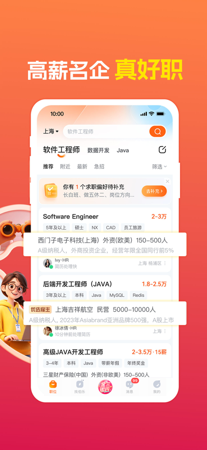 前程无忧51Job,专业招聘、求职平台。 众多知名公司、行业大厂都在前程无忧招聘人才、发布职位。海量职位信息覆盖了各行各业,给求职者提供了丰富的选择。 互联网、金融、房产、汽车、快消……各行业大咖都在这里抢夺人才。 销售、财务、技术、客服、产品……各岗位的求职者都在前程无忧投递简历。 企业选择在前程无忧招聘人才,更高效找到理想人选。 求职者选择在前程无忧寻找工作,更快速找到满意工作。 【职位推荐】岗位太多如何选?填写求职意向,为你精准推荐心怡岗位 【秋招专场】神仙外企、大厂实习、国企热招,高薪热岗助你赢在秋招 【好职专区】关注热门专区岗位上新提醒,掌握一手求职资讯,好工作不错过 【人才推荐】海量人才库,精准推荐,招人就是快 【在线沟通】随时随地,在线回复求职者消息,多沟通更有机会撩到人才 【智能邀约】一键匹配精准人才,邀请投递,让招聘更高效 “比一般的招聘软件靠谱的多,都是真实信息,少走很多冤枉路”by 共赏人 “去努力,去投递,才有机会。离职一段时间了,今天终于收到了offer,是自己心仪的企业。每天登录前程无忧很多遍,从焦虑到后面稳定对待,这个app伴随了我这段最难的时间,感谢前程无忧。”by才子佳人 “适合招聘应届毕业生和白领,尤其是一二线城市。推荐”by herowang “招人挺好用的,简历量多,搜索的简历匹配度和质量高”by hryoyo 我们一直在继续努力,希望每次改变都能让你拥有更好的求职体验,随时欢迎联系我们: 服务热线:400-620-5100 微信服务号:前程无忧51Job服务号(ID: JOBS_51job) 官方微博:祝你前程无忧 抖音账号:前程无忧51job(ID: JOBS_51job) 官方网站:https://www.51job.com 手机网站:https://m.51job.com 邮箱:appsadmin@51job.com