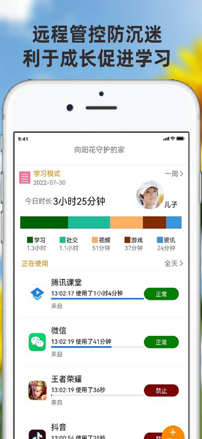 1. “向阳花守护”可让家长远程对孩子使用的手机、平板或电脑进行管控,除了可实时禁止或限制正在使用的游戏,视频等各种应用以外,还可以通过时间计划,时长限制,类型限制,应用限制,护眼锁屏等方式为孩子制定合理的使用规则,培养良好的使用习惯,远离网络沉迷。 2.“向阳花守护”内置开放,学习,禁止三种使用模式,分别适用于娱乐,学习,休息等各种不同的情况。开放模式下孩子的手机就是普通手机,所有应用都可使用,而学习模式下,手机会自动变身为学习机,孩子只能使用学习类应用,访问与学习相关的内容,其他娱乐应用和内容都会被自动禁止,保证学习不受外界的干扰和影响。在禁止模式下手机会自动变为功能机,只能打电话,发短信等。家长平常的管理只需要一键切换这几个不同的模式即可,简单易用。 3.“向阳花守护”同时提供了远程地理位置定位,轨迹跟踪,护眼锁屏,屏幕截图等众多实用功能。但同时也非常注重对孩子隐私的保护。家长对孩子的手机进行截屏,地理定位时需要孩子同意才可以,在保障家长知情权的同时,也同样保护孩子的隐私,尊重孩子的感受。 4.“向阳花守护”还提供了学习任务主动引导功能,家长可下发学习和生活任务,孩子完成后,打卡提交,可自动解锁手机时间。帮助家长培养孩子长期使用习惯,并引导孩子的主动性,积极性。 5.“向阳花守护”还向家长提供定制的向阳花WIFI路由器,通过WIFI网络的方式对家里其他的PC,手机,电视,天猫精灵等各种联网设备进行完善的管理,管理方法完全相同,容易使用。 6."向阳花守护”凝结了数万家庭防沉迷教育的心得体会和宝贵经验,并以分享课程的形式提供给各位家长。帮您拨开重重迷雾,找到科学,合适孩子的教育方式和方法。 7.“向阳花守护”建议各位家长在使用各项管控功能的同时,更要和孩子多沟通!多互动!只有将客观管控和主观教育引导结合在一起,才能达到长期教育培养的目的。 8.“向阳花守护”希望在平衡孩子学习成长和使用电子产品方面能成为您的好帮手,能真正帮助到您和孩子。“向阳花守护”衷心祝愿,每个孩子能够健康成长,学习进步,早日成为祖国的栋梁之才,同时玩的高兴,过的快乐,享受幸福和自由的人生。